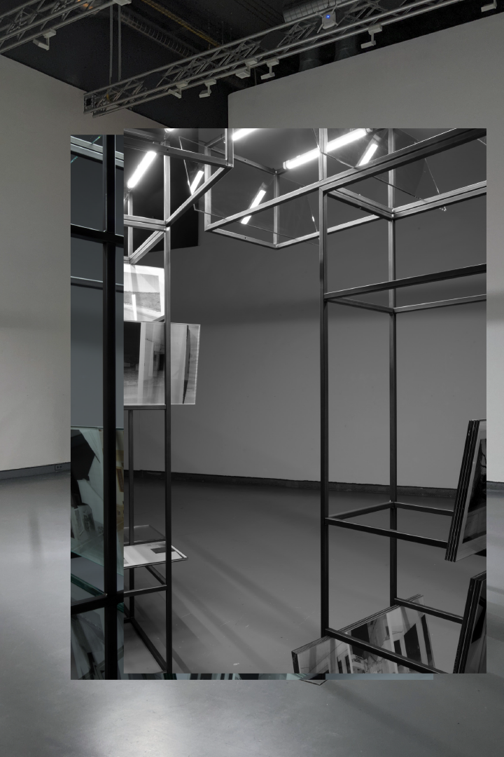 Die Installation »Centro« setzt die Abstraktion der Fotografien mit installativen Mitteln fort. Ein Objekt aus Stahlgerüsten, Fotografien unter Glasplatten und blitzlichtfarbene Lichtleisten bilden den alleinigen Bezugspunkt im Raum. Das Objekt benötigt lediglich den Boden als Standfläche. Die Leere drumherum, die sich im abnehmenden Licht verliert, kontrastiert diese Autonomie mit einer Verlorenheit. Die Geometrie des Gerüsts zitiert die postmoderne Bauweise Gibellina Nuovas. Gleichzeitig scheint das Objekt Ausschnitt einer Bewegung zu sein. Zwei oder mehr Teile driften zu- oder auseinander. Die Betrachtenden sehen den Moment einer Bewegung. Architektur, Fotografie und Installation werden gleichwertig in Beziehung zueinander gesetzt, um Wechselwirkungen zu erzeugen. Beim drumherum- oder auch hindurchlaufen verändert der Körper permanent seine Form. Aus der Nähe betrachtet, tritt der architektonische Eindruck des Körpers zurück und transformiert sich in ein Objekt zu Aufbewahrungszwecken, gefüllt mit Fotografien. Ein Verweis auf Gibellina Nuova als Archiv seiner eigenen, dramatischen Geschichte. Fragile Laserkopien und -drucke befinden sich zwischen Stapeln aus dickem Sicherheitsglas. Den Betrachtenden wird die Möglichkeit des Durchstöberns suggeriert, welche durch die Schwere der Glasplatten jedoch unmöglich ist. Zwischen Statik und Bewegung liegt der Moment. Beim Umkreisen des Objektes setzen sich die Bilder in Beziehung und vereinzeln sich wieder. Die Anordnung der Fotografien als Tryptiche schafft eher lose Gruppierungen, denn feste Verbindungen.
