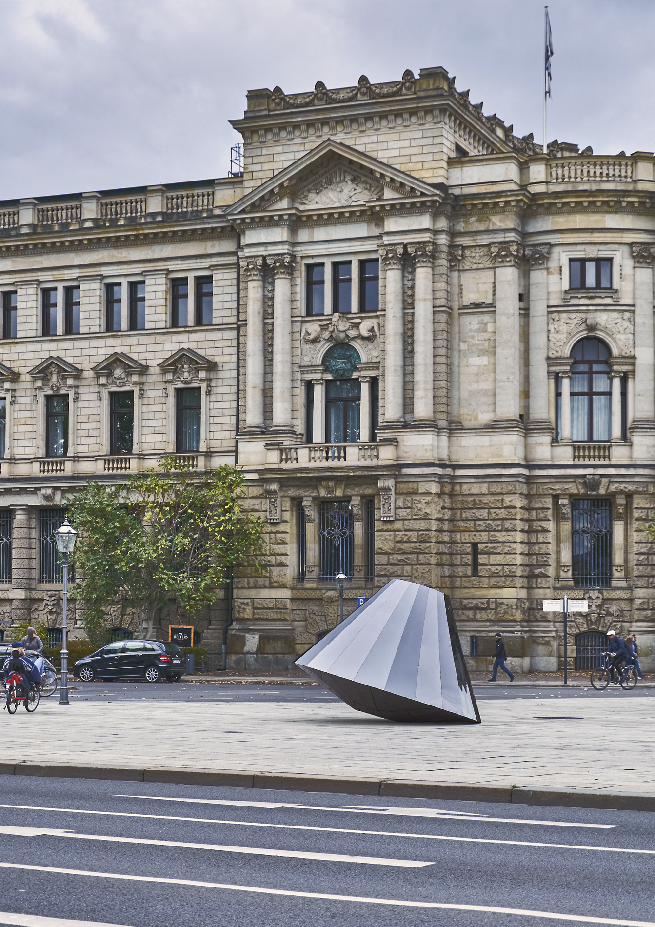 APOLLO, 2018, Wilhelm-Leuschner-Platz Leipzig Alu-Dilite Spiegel, Alu-Blindnieten, Blech, Holz, Sandsäcke: 2,5 x 3,13 x 3,13 m