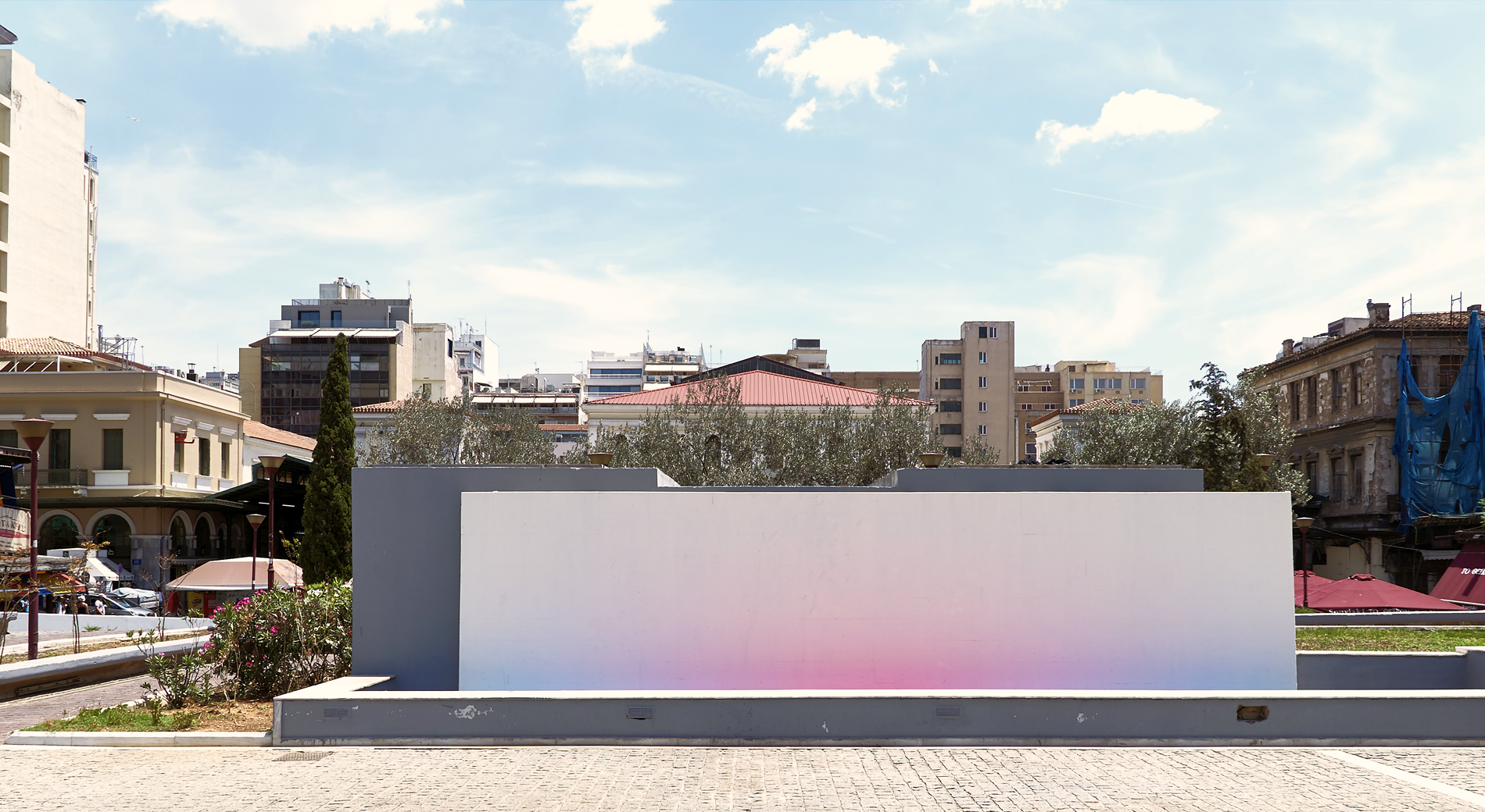 ADIO, 2016, Athen Gouache auf Wellpappe, Sonnenlicht; 1,6 x 7 m;