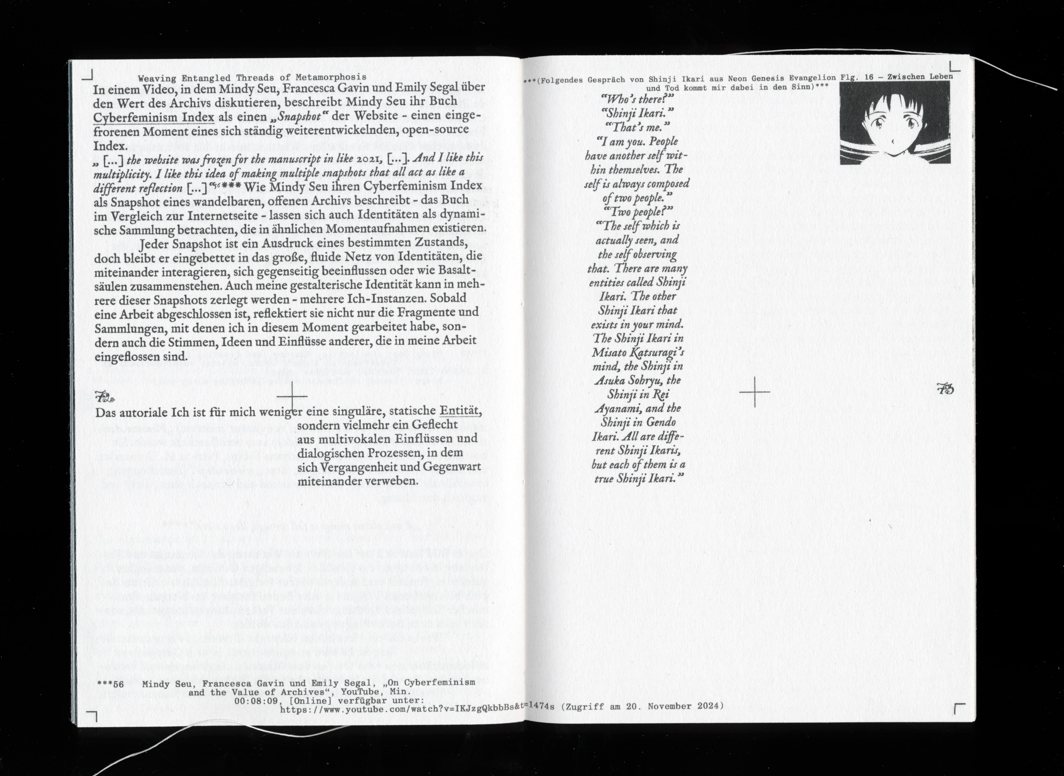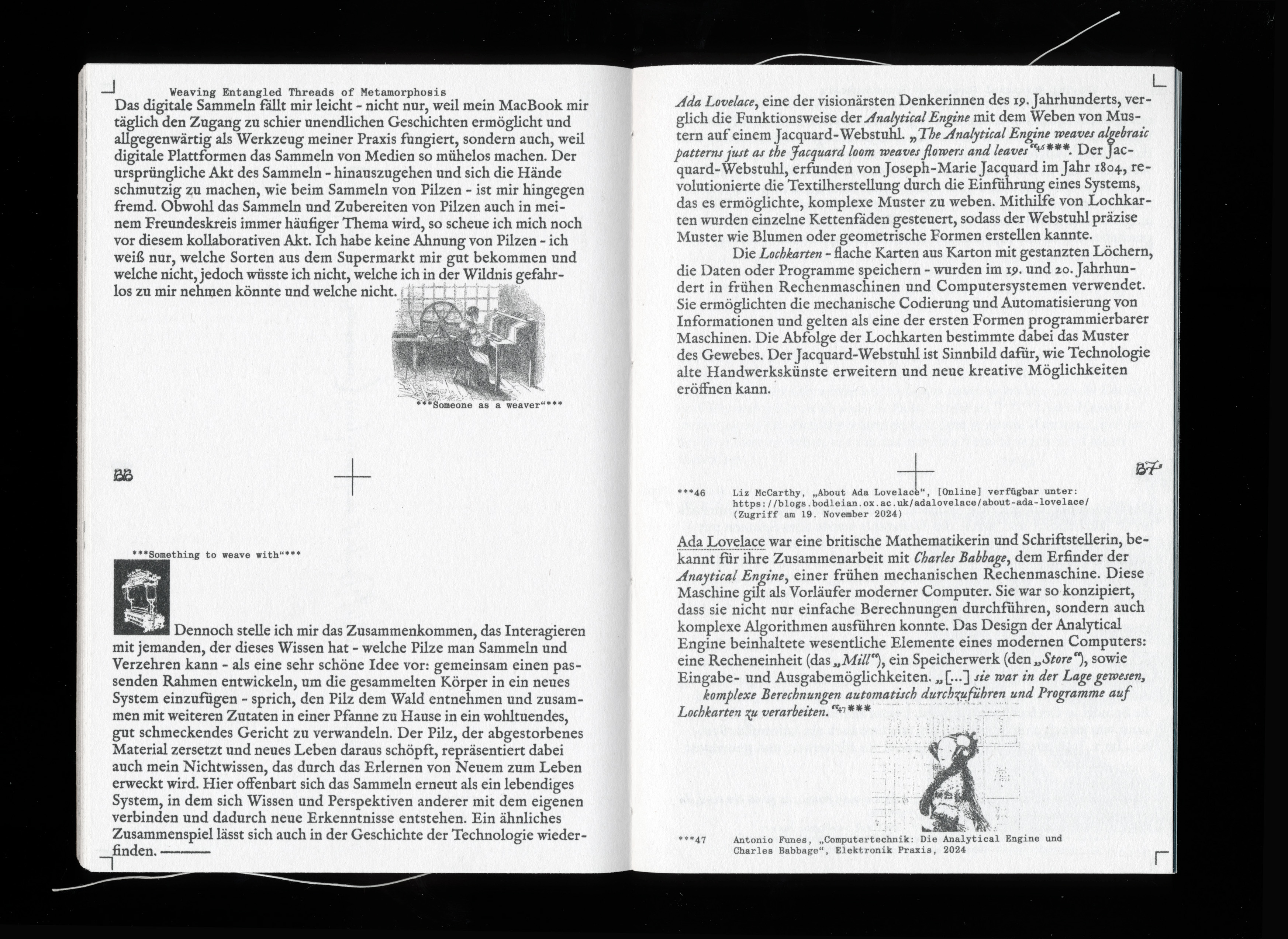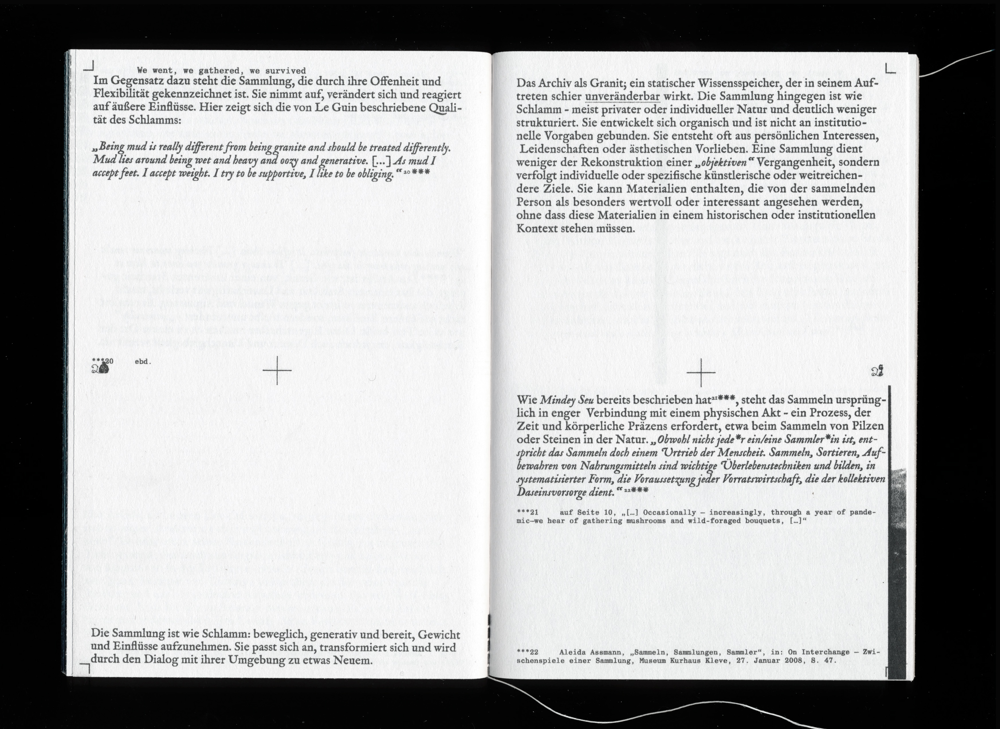 Diese Arbeit versteht das Sammeln als eine Methode des Wiederverbindens: von Zitaten, Bildern, Stimmen, die im Moment des Gestaltens neu zueinander in Beziehung treten. Was zusammengetragen wird, bleibt durchlässig — es geht weniger um Ordnung als um Resonanz. Gestaltung wird zum Fadenziehen durch ein Netz aus Fragmenten; Typografie zum Raum, in dem diese Verbindungen sichtbar schwingen dürfen.