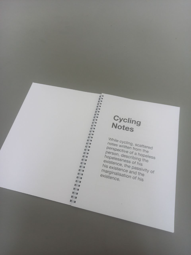 Ein hoffnungsloser Mensch macht sich beim Radfahren Notizen. Die Hoffnungslosigkeit seiner Existenz, die Passivität seiner Existenz und die Marginalisierung seiner Existenz. Sie berühren Themen wie Wachstum, Schmerz und Isolation.