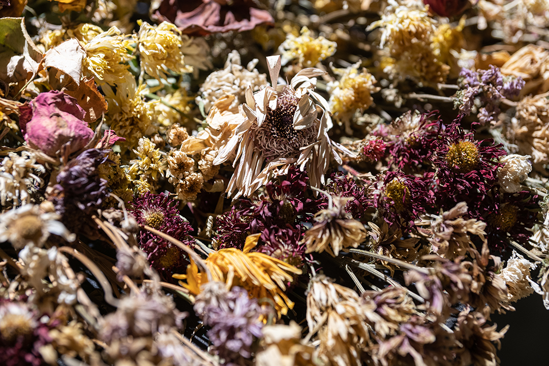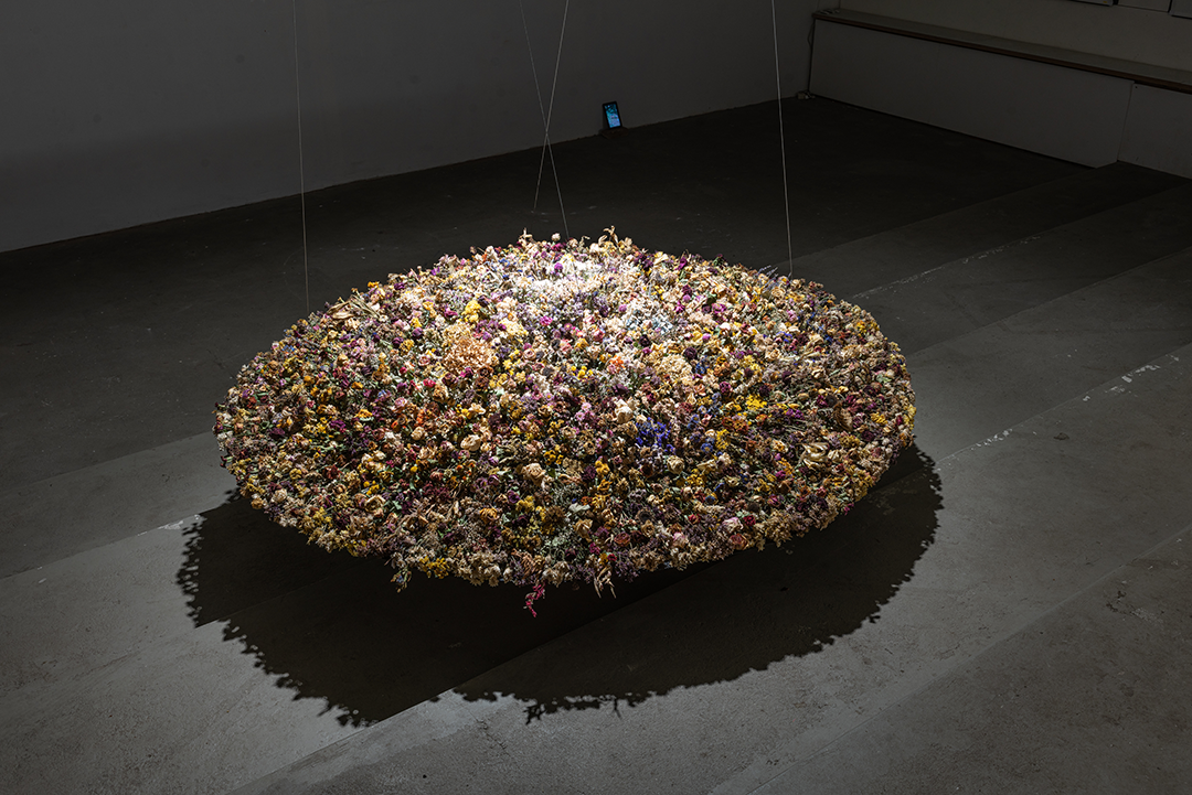 Eines Tages habe ich in einem Buch den schönen Satz gelesen: „Ein Friedhof ist eine wie aus der Zeit genommene Landschaft“. Ein Friedhof ist ruhig und schön. Aber der schönste Ort innerhalb des Friedhofs ist dort, wo gerade eine Beerdigung stattgefunden hat. Da, wo frische, bunte, schöne Blumen geschmückt sind. Die Situation, dass Leben und Tod an einem Ort zugleich sind, ist für mich ambivalent und daher interessant. Aber, was mich noch stärker beeindruckt hat, waren die verwelkten Blumen im Kompost-Müll. Das war ein Moment, in dem ein Wesen existiert und zugleich vergeht. Seit zwei Jahren sammel und trockne ich die Blumen. In dieser Arbeit stecken Zeit und Erinnerungen von zwei Jahren.