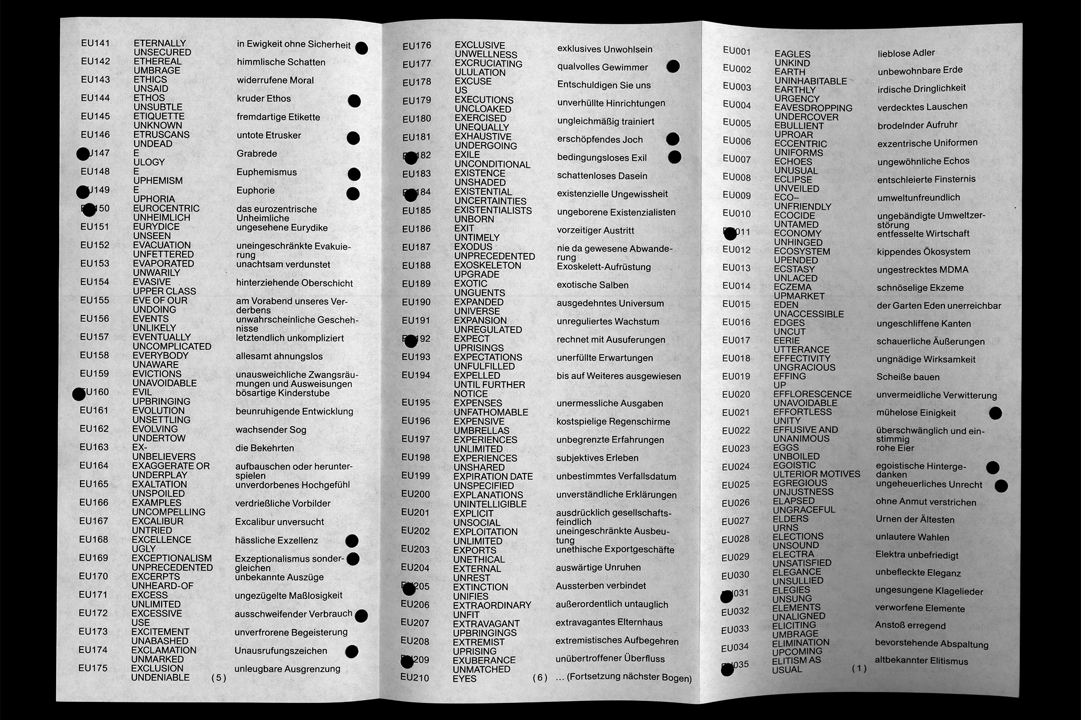 The acronym “EU” unites infinite experiences, demises, conflicts and desires. Different positions induce to look into ones own identity and representation.
