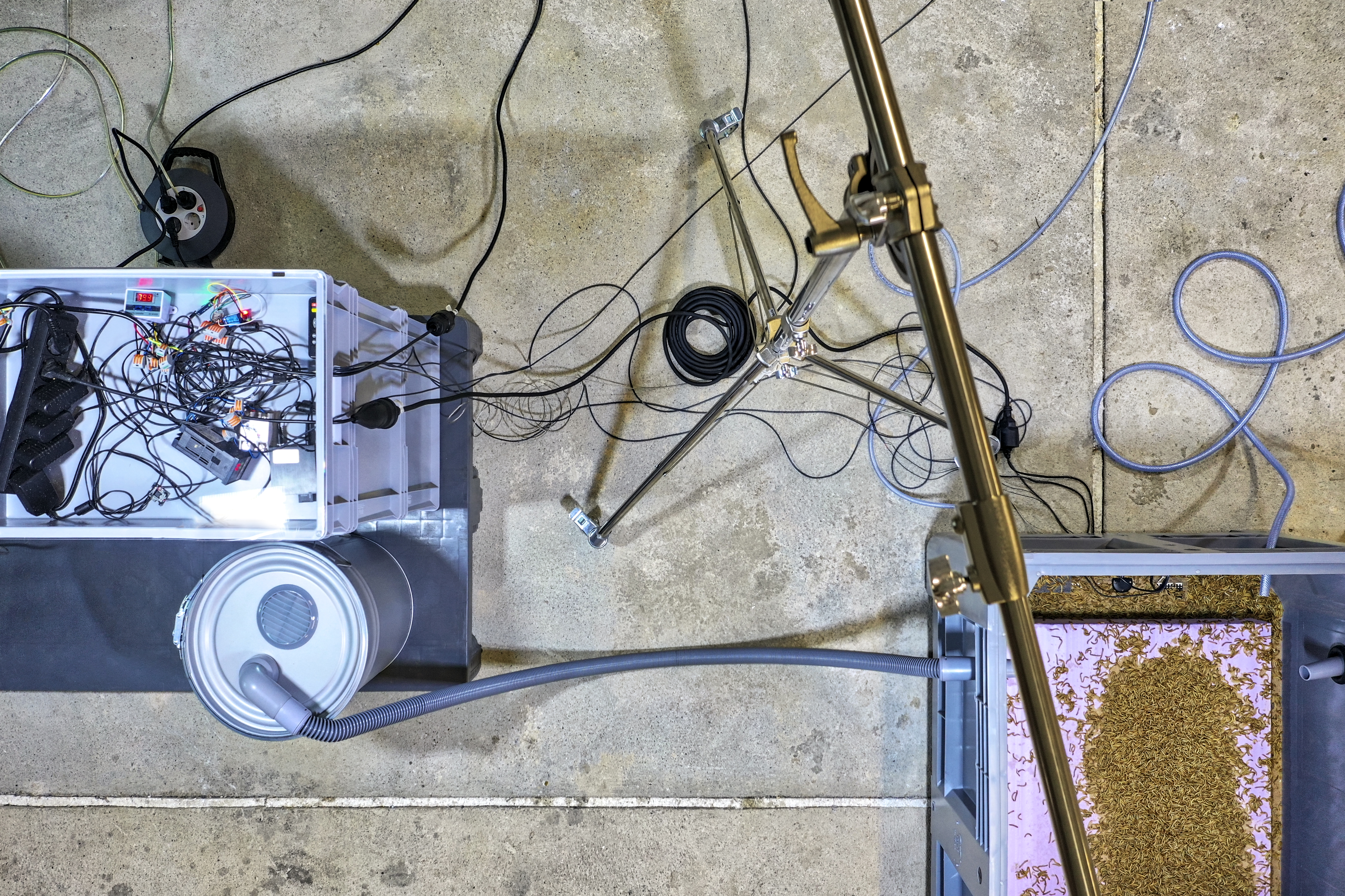 Yana Zschiedrich lässt in ihrer Installation den Baustoff Styropor von Mehlwürmern zersetzen, die ihrerseits eigentümlich amorphe Skulpturen hervorbringen. Die Mehlwürmer werden während der Ausstellung von einer halbautomatisierten Zuchtmaschine versorgt. Der Ausstellungsraum wird gleichzeitig zum Labor.