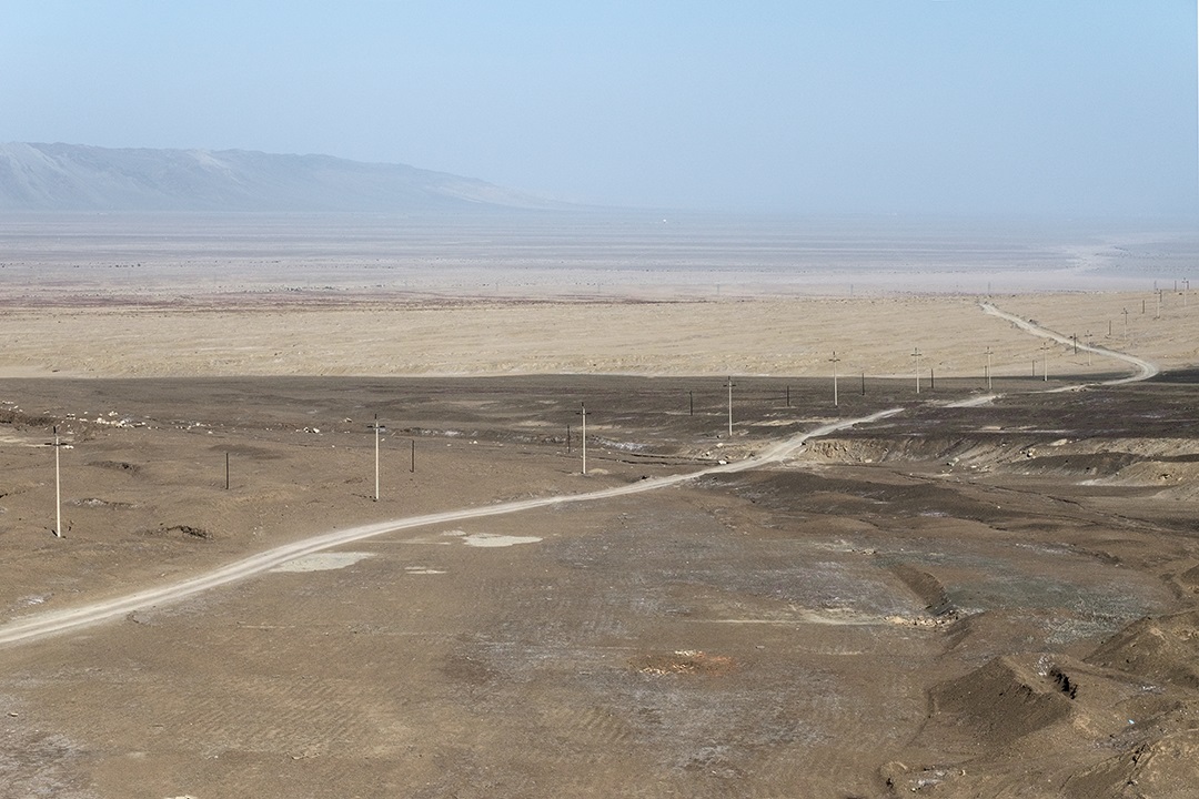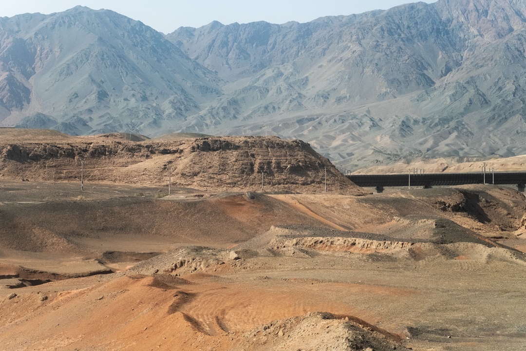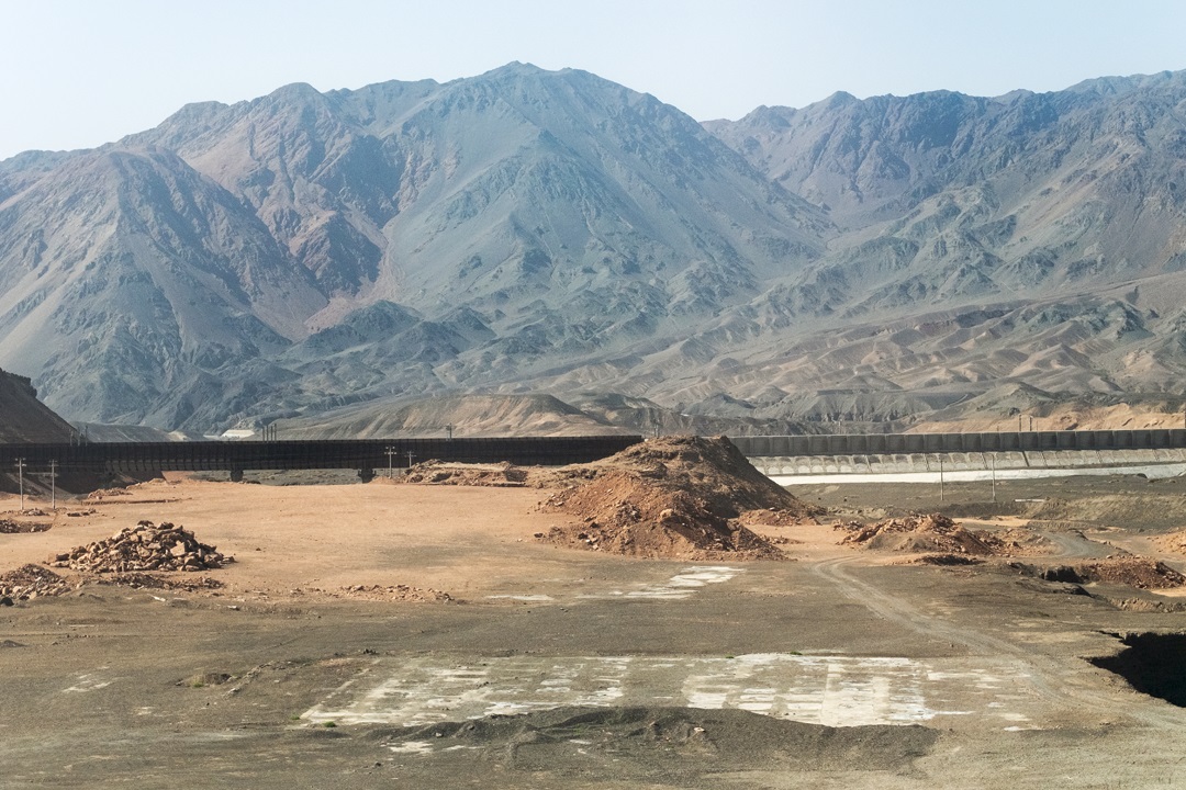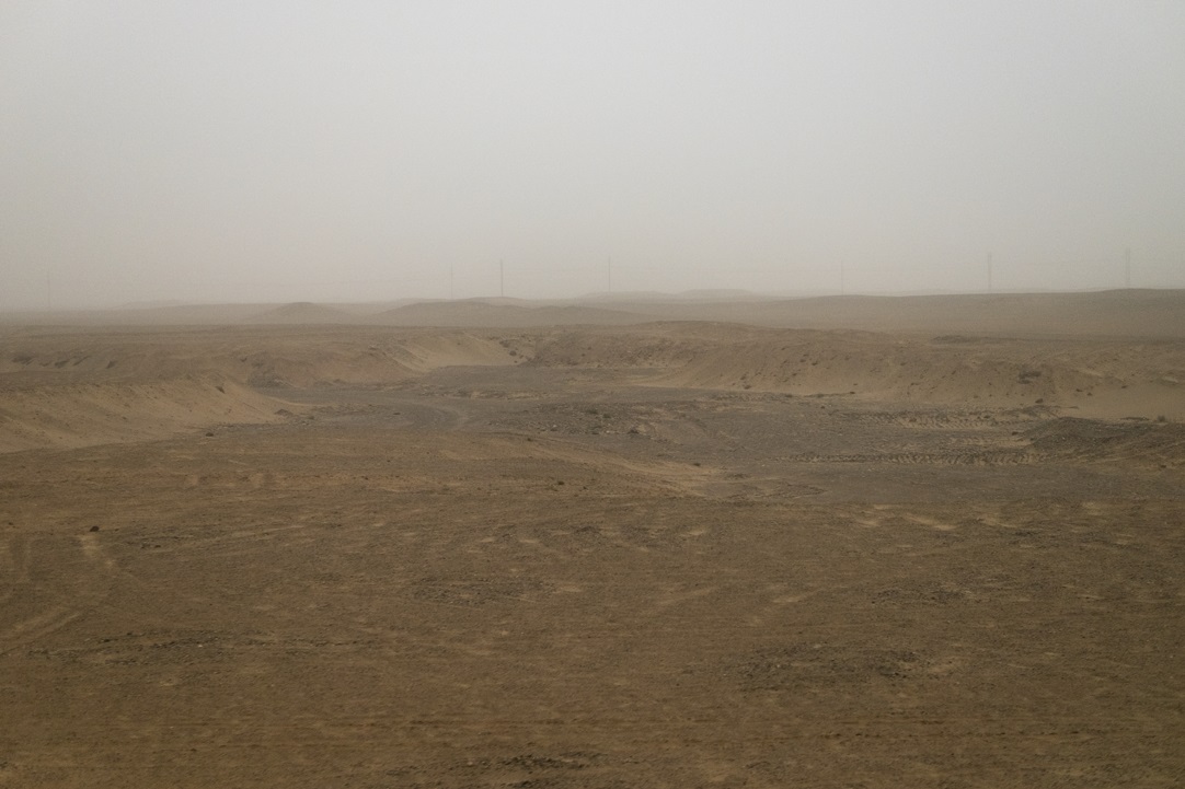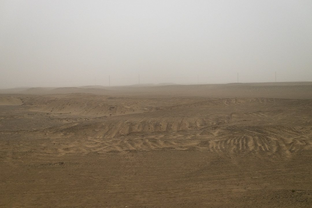 Für die Arbeit VIA wurden bestimmte Parameter gesetzt: auf einer insgesamt 12.000 km langen Strecke durch die westchinesische Region Xinjiang fotografierte Julia Debus ausschließlich im Transit zwischen Städten und Orten am Tag permanent aus dem fahrenden Zug heraus.
