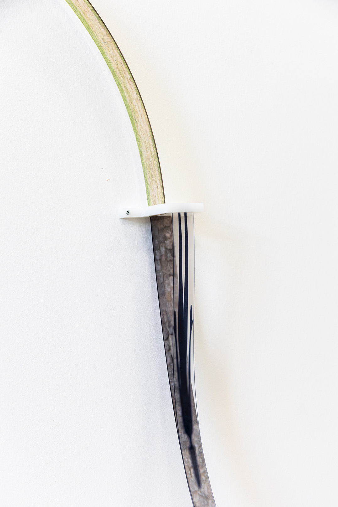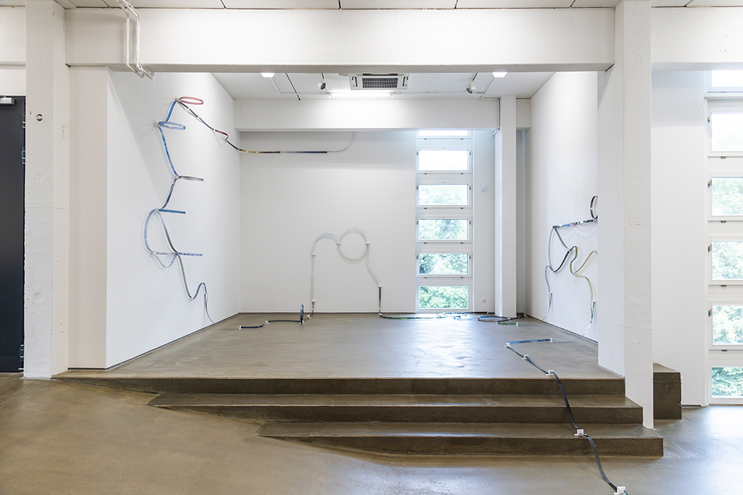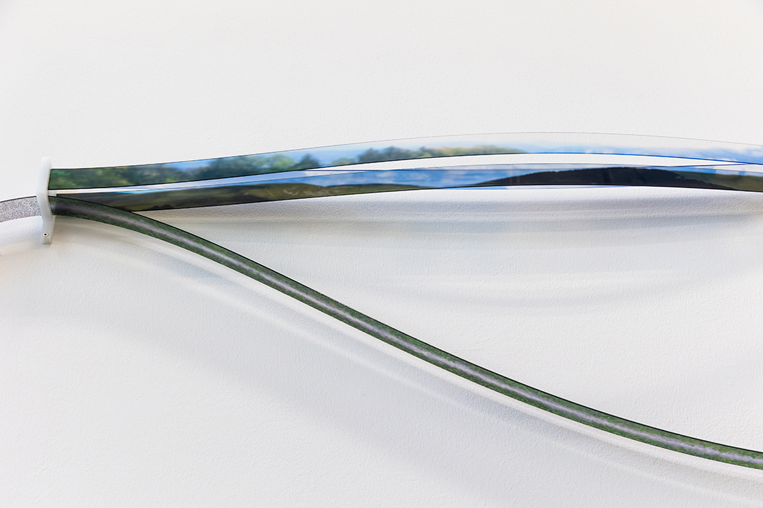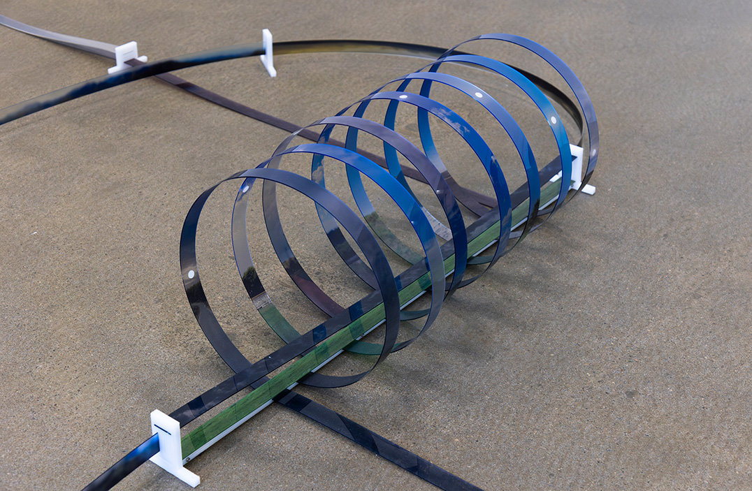 Maps, Slides, Loopings setzt sich aus einem wachsenden Inventar auf Acrylglas gedruckter Bildelemente zusammen, die variabel durch Kunststoffhalterungen miteinander verbunden und im Raum angeordnet werden können. Die jeweils 1 Meter langen, transparenten Streifen zeigen verschwommene Fragmente von Landschaften, Böden und Wetter. Sie stehen modellartig für die Blicke, Umgebungen und Strecken potenzieller Lebensrealitäten ein und ergeben lose Erzählungen, die sich an unbestimmten Orten abspielen. Eine Aneinanderreihung möglicher Perspektiven auf eine sich ständig scheinbar wahllos austauschende Umgebung.