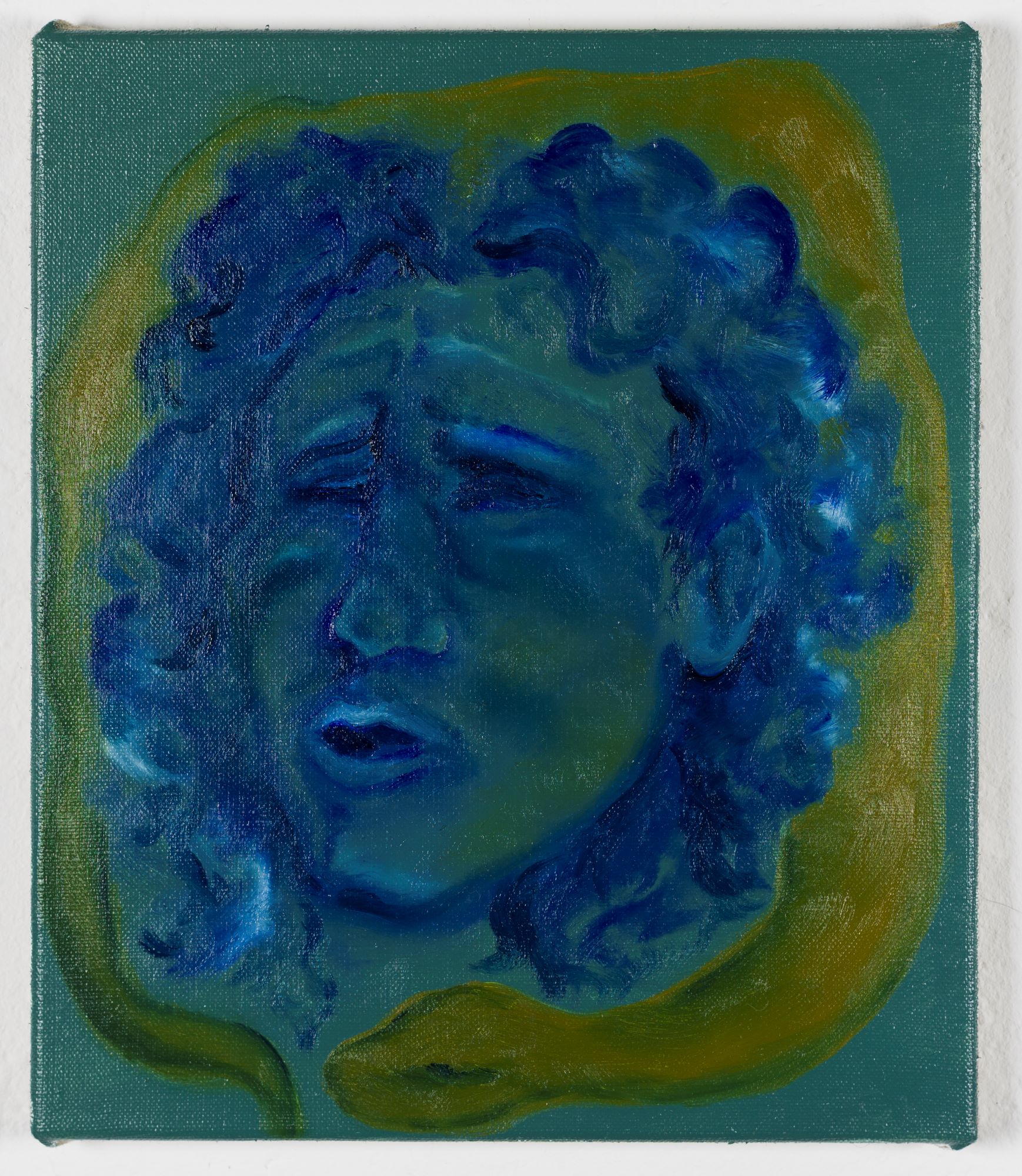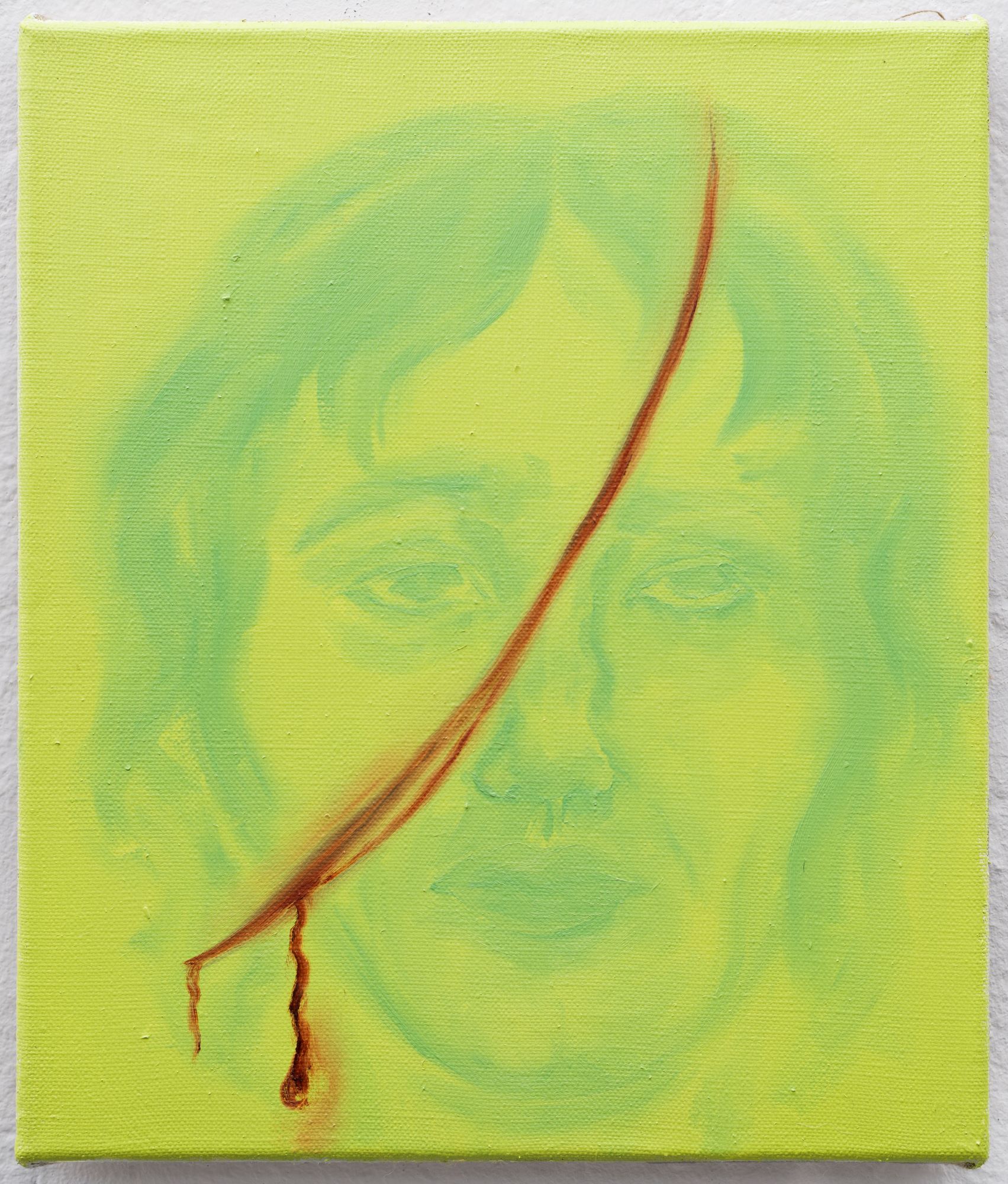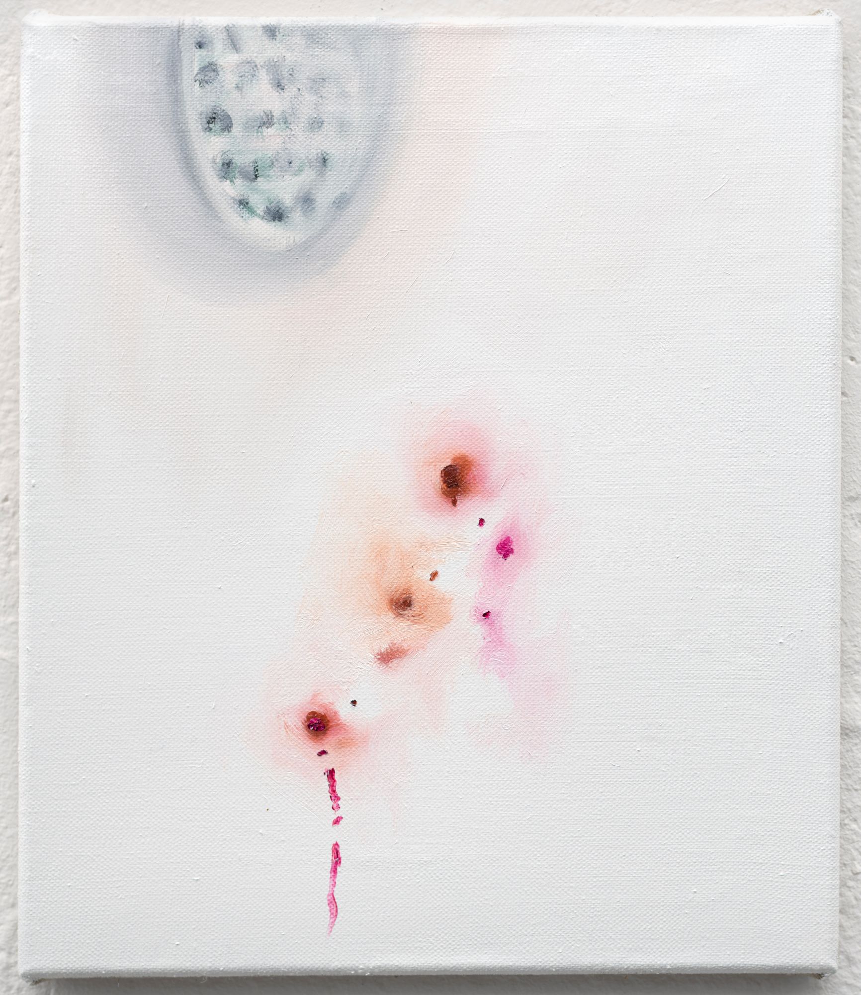 Von hinten durch die Brust ins Auge beschreibt einen unnötig komplizierten Zugangsweg. Zugleich ist es dieser unmögliche Schuss, der präzise den ganzen Körper durchdringt. In einem CT wird dieses Durchdringen plötzlich möglich und leicht. Bilder von Körpern bauen sich Schicht für Schicht auf und ermöglichen Beobachtenden einen voyeuristischen Blick ins Innerste. Der Wunsch, durch die Schichten zu dringen und hinter die Oberfläche zu blicken, entsteht sowohl in der Malerei als auch in der Beziehung zum Objekt der Begierde. Doch weder die Leinwand noch das andere lassen sich komplett durchdringen oder verstehen. In ihrer Arbeit nähert sich Karolina Koßmann Körpern, Objekten und Ideen an, die sich immer wieder verflüchtigen. Wie nah können wir Werken und Sehnsüchten wirklich kommen?