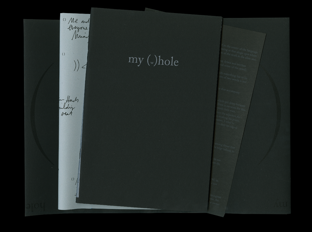 "my (w)hole" ist am Fragment interessiert, an der Lücke, dem (meinem) Loch. Hunger als Ritual der Einschreibung, in eine Tradition von Schreibenden die ihn nicht auf der Zunge tragen konnten, stattdessen den Stift halten mussten. Begehren zu Füllen (gefüllt zu werden) als Verb, als Anstifterin und als Suche, nach einer Sprache die den Loch-Leuten gehört. Das Umschreiben des Lochs ist an dem Ort interessiert, an dem Sprache vom Körper der Schreibenden abweicht. Der Fehlschlag, die Wiederholung, die Fragmentierung der Sprache: Erato gefallend, Sappho folgend. Sprache gleich eines Waldes, markiert von Lichtungen aus denen die Übersetzung des Atems einer écriture féminine sich in Worten wiederfindet — Typographie als verzweigtes Echo welches in und aus dem Wald heraus schallt. Schreiben und Typographie im polyphon der Übersetzung. Die Anordnung von Sprache auf der Seite nicht als beauty treatment (wellness für die Worte) sondern als einen Eingriff in Sie, der sie verändert, ebnet oder umstößt. Begehren als Eindringen. In wen? Sie. Jedes Zeichen ein Strang, eine Verbindung innerhalb des größeren Gewebes, anmutend eines Wurzelteppichs, verworren in den Handgelenken Schreibender die vor und während dieses Textes kamen. Jede Schreibende eine Arachne, jedes Wort eine Kopula. Spinnentiere unter sich. "my (w)hole" beschäftigt sich mit der Verzweigung von Begehren und Prozessen der Wissensaneignung. Typografie als Spleiß, um die Stränge die den Text tragen Sichtbar zu machen. Schreiben als Händchen-halten. Schreibende sein, als das Knüpfen eines Strang als Einkreisung des ( ) (Lochs?) Das was an diese Stelle gehört, ist ein "Ich-will-mehr". Die Wölbung eines Nackens, ein Komma, eine Handtasche, ein Satz, Sappho… Wir trauern um die Lücke. Die Überlieferung des Fragments, war was uns zusammenbrachte.