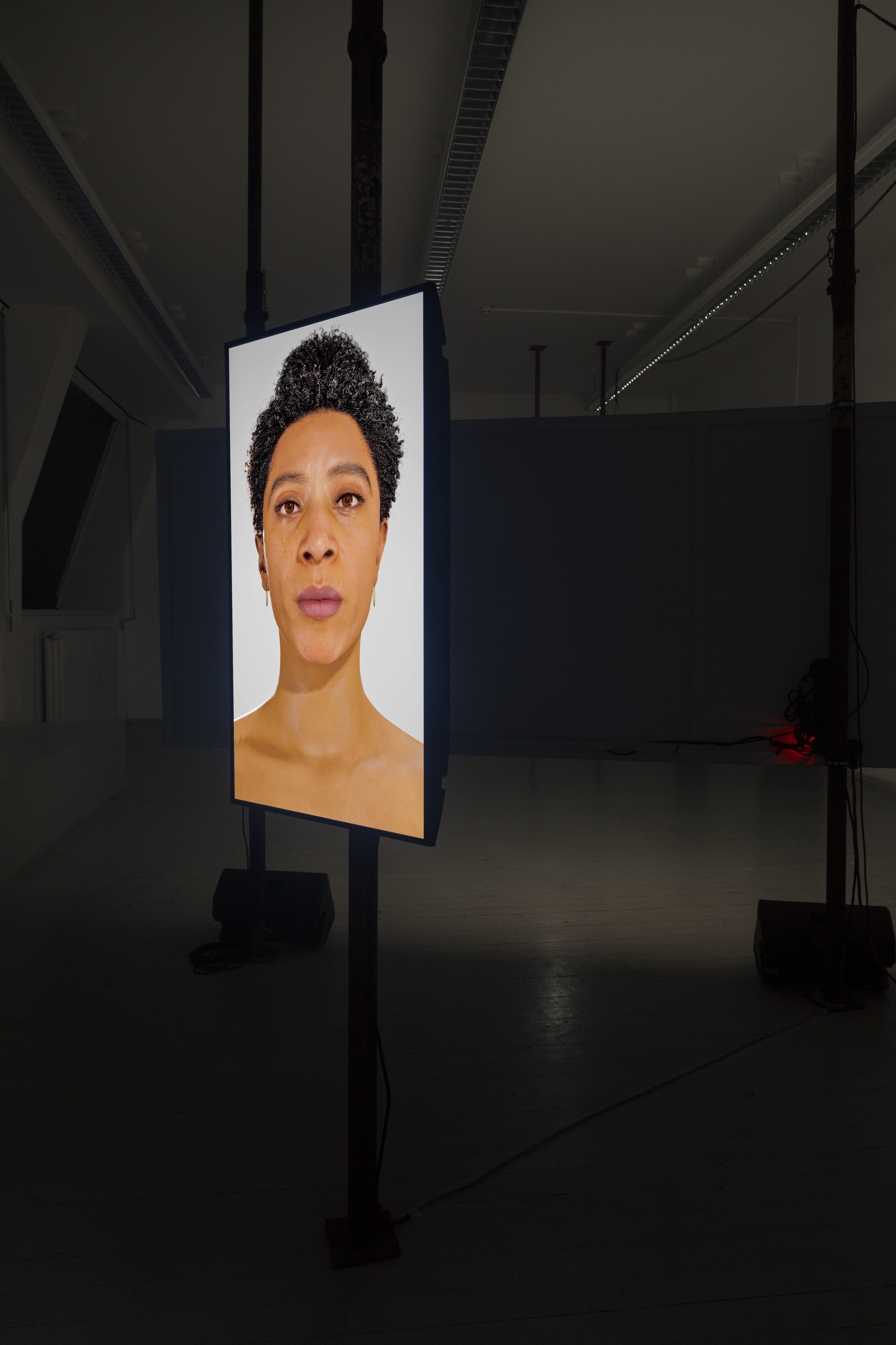 Die Rauminstallation "Nichts als solide", bestehend aus zwei Videoarbeiten, "Nichts als solide" und "Haltung", können als Auseinandersetzung mit den­jenigen Spuren verstanden werden, die Menschen in ihrer Umgebung hinterlassen und die sich in Landschaften und Orte einbrennen. In Konversation mit Gedichten der jüdischen Lyrikerin Mascha Kaléko und der afro-deutschen Dichterin May Ayim, die als Datensatz für eine künstliche Intelligenz dienen, entsteht ein Monolog, in dem sich ein neues, fiktives Lyrisches Ich formiert. Durch das Medium dieses virtuellen Wesens hindurch stellt die Künstlerin nicht nur Fragen nach Identität, sondern beantwortet sie mit Selbst­ermächtigung, indem sie die von der KI generierten Aussagen und ihre eigenen Worte in einen Kontext setzt, aus dem sich eine dezidierte Haltung ergibt.