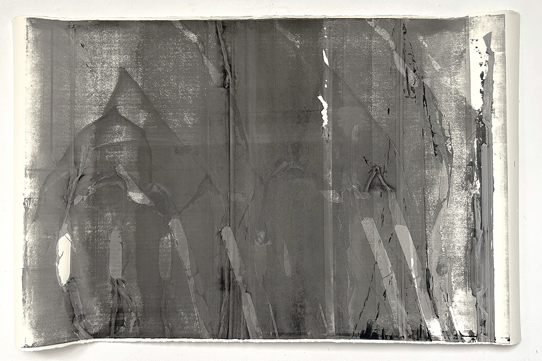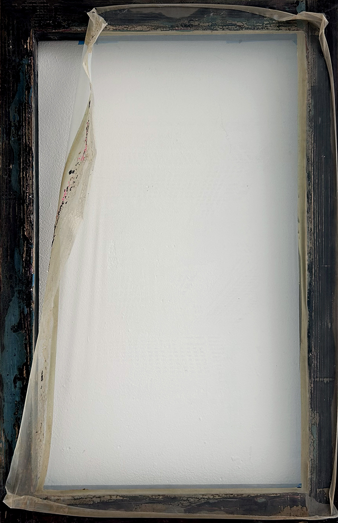 Im Mittelpunkt meiner Arbeit stehen das Druckverfahren und das Material. Ein einfaches Stück Klebeband auf einem Bildschirm dient mir oft als Ausgangspunkt — analog zu einer Eingabeaufforderung bei der KI-Bilderzeugung. Doch während die künstliche Intelligenz unendliche digitale Ergebnisse hervorbringt, werden meine „Eingabeaufforderungen“ durch Farbe und Gewebe verarbeitet und durch Rakelbewegung, Zeit und Auslöschung verändert. Ich kombiniere den Siebdruck mit traditionellen Malgründen, Lasuren, Offsetfarben oder Fotoemulsionen. So ist der Siebdrucktisch zu meinem expressiven „Pinsel“ geworden.