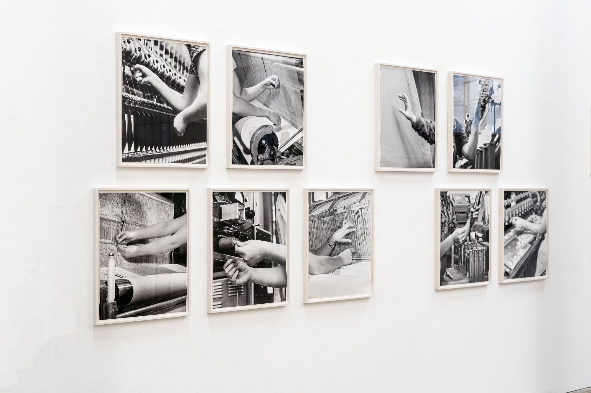 Durch das Isolieren einzelner Bildelemente greift Schacht in ihren Arbeiten in das historische Material ein und überführt es in neue Bedeutungszusammenhänge. Indem sie die Ausschnitte wiederum in Bildsektionen *1 aneinanderreiht, wiederholt sie dabei nicht nur den patriarchalen Akt des Kategorisierens und Klassifizierens, sondern verdeutlicht den patriarchalen Blick und Zugriff auf die Frauenkörper, der sich in den sich wiederholenden Gesten und Haltungen verdichtet, legt diesen offen und dekonstruiert ihn. Dieser scheint die Textilarbeiterinnen festzuhalten, ihre repetitiven Arbeitsabläufe und -bewegungen zu dirigieren und inszenieren – und ihnen so eine bestimmte Funktion in dieser (Bild)Welt zuzuteilen. Gleichsam führt er uns an die Stellen und Momente, die in der Regel gar nicht großartig auffallen, und die nicht nur in den historischen Fotografien, sondern auch in der westlichen visuellen Kultur von heute allgegenwärtig sind und unsere Wahrnehmung des weiblich gelesenen Körpers mitbestimmen. Die sozialistischen Bilder zeigen „produktive“ Frauen als gemeinschaftsstiftendes Sinnbild: Ein Motiv, das in zahllosen Varianten in vielen Bildarchiven liegt und ein Narrativ abbildet, das bis in die turbokapitalistische Gegenwart reicht und Fragen aufwirft: nach der Rolle und Wertschätzung der von Frauen geleisteten Arbeit, nach Machtstrukturen und damit zusammenhängender Ungleichheit. Um der politischen Dimension dieser „Frauenkörper“ nachzugehen und eine Brücke in die Jetztzeit zu schlagen, nimmt Schacht auch die körperliche Dimension von Erinnerung in den Fokus: Wie schreiben sich Erfahrungen und Empfindungen in Körper ein? Inwiefern können diese generationsübergreifende Erinnerungen speichern?