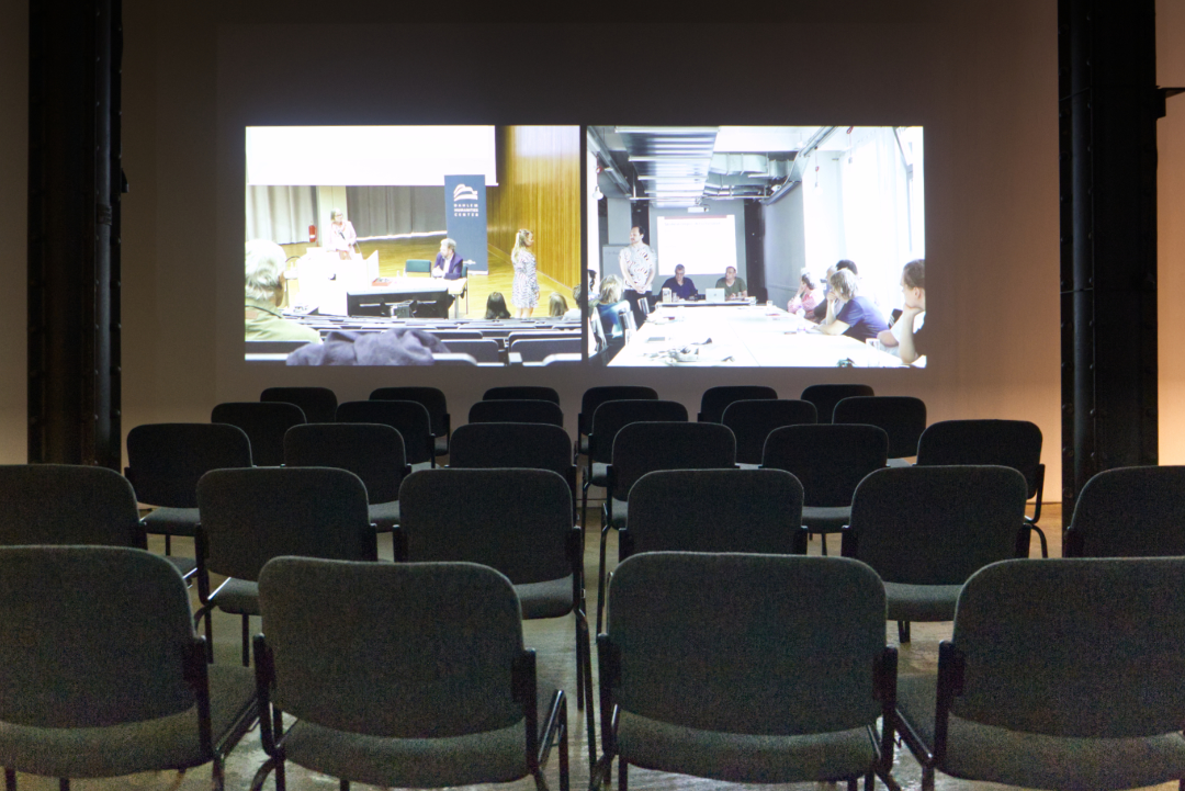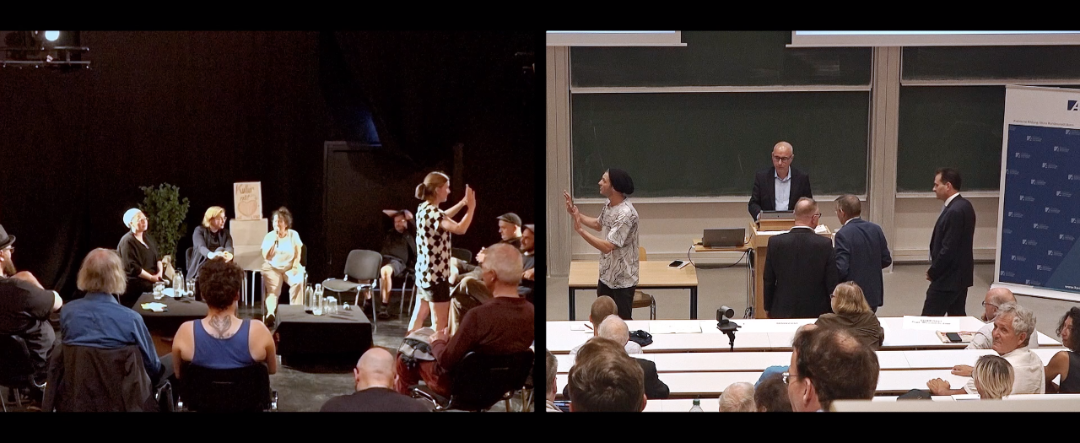 In der Arbeit „Romeo vs. Julia“ interveniert das Künstlerduo Mailand / Innenhof mittels drei pro-minenter Dialoge der Theatergeschichte in ausgewählte Vortragsveranstaltungen. Sechs Schau-spielende greifen jeweils alleine und unangekündigt in die Veranstaltungen ein, die in unterschied-lichen Städten, an verschiedenen Tagen und zu diversen Themen stattfanden und performen solo ihre jeweiligen Sprechanteile. In der Ausstellungssituation werden die Videoaufzeichnungen zu-sammengesetzt und die Dialoge somit vervollständigt. Es entsteht eine ineinander verschränkte Diskurscollage über Raum, Zeit und Kontext hinweg.