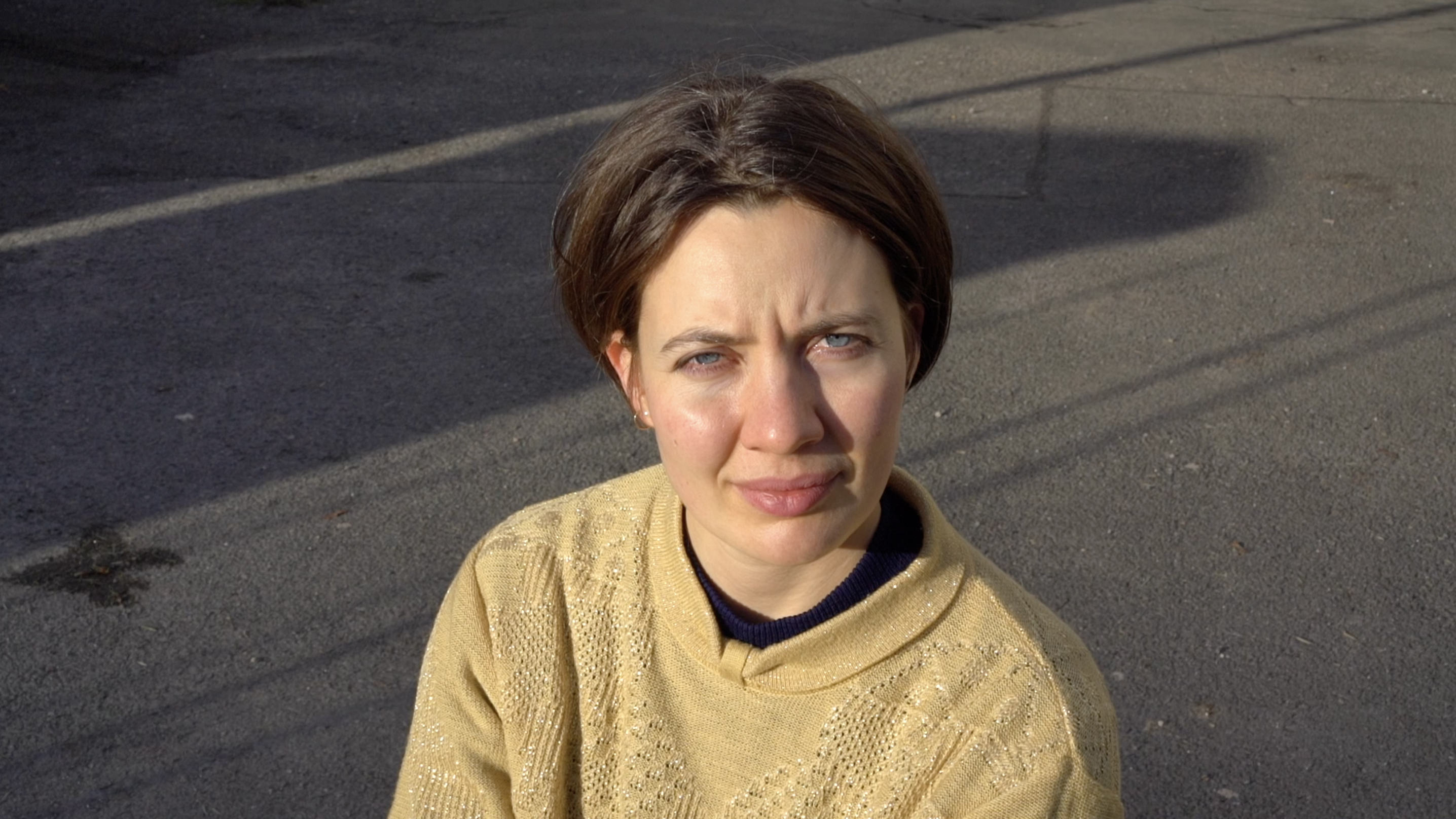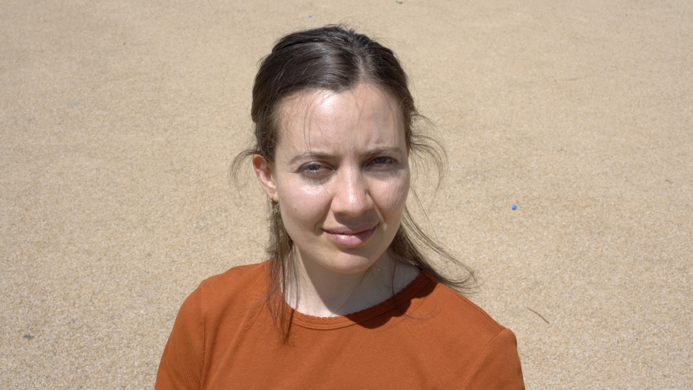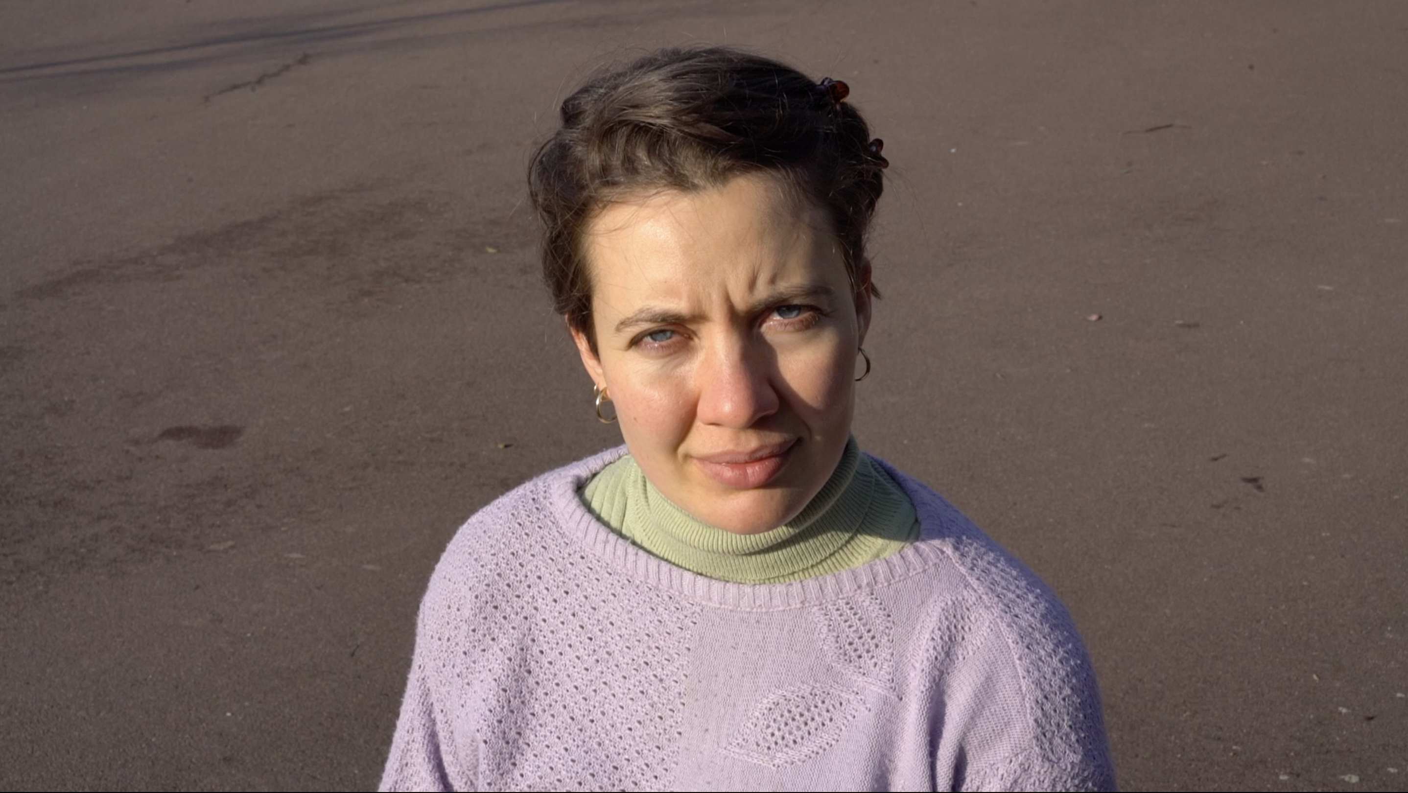Eine Person wird gefilmt, während sie von der Sonne geblendet wird. Die Sonne fungiert als Gegenspielerin, sie kann wärmen, blenden, beleuchten, verbrennen; sie schreibt sich in das, auf das sie trifft ein, hinterlässt Spuren. Sie ist, nicht zuletzt, existenziell, sie gibt Licht, Leben. Sie ist fundamental mit der Fotografie verbunden. Sie verändert den Gesichtsausdruck der Person und steht sinnbildlich für eine Begegnung mit der Welt, für eine Störung, etwas, auf das es zu reagieren gilt. Der*die Betrachter*in nimmt die Position der Sonne ein. Durch die Dauer der Aufnahme und den permanenten Blick der gefilmten, von der Sonne geblendeten, Person wird der *die Betrachter*in immer wieder auf sich selbst zurückgeworfen. Wie lange kann ein Blick ausgehalten werden? Wer schaut wen an? Welche Art von Dialog entwickelt sich zwischen der filmenden und der gefilmten Person, zwischen der gefilmten Person und dem*der Betrachter*in? Welche Machtstrukturen entstehen durch den Blick, das Schauen, das Zurückschauen?