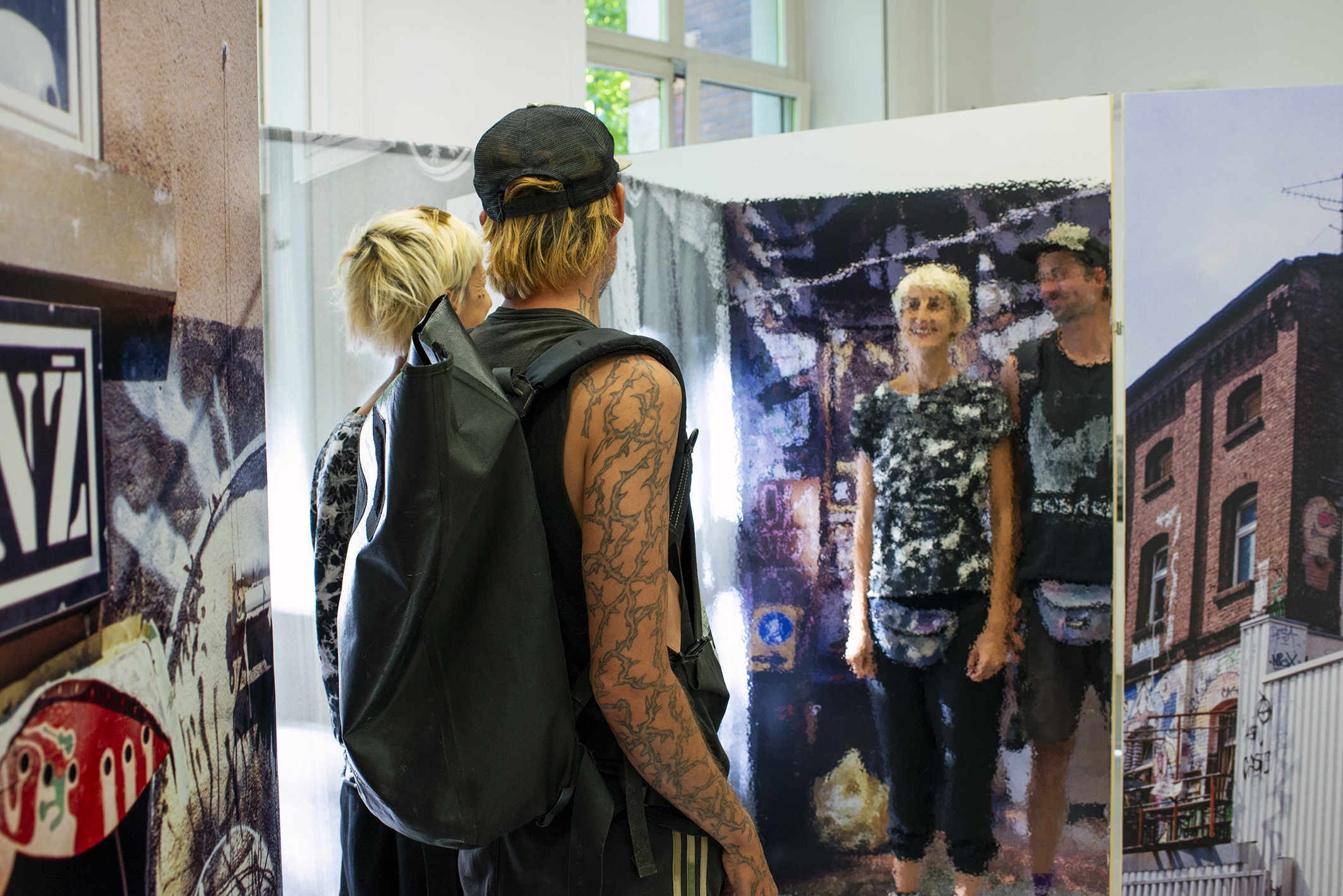 unser jetzt ist eine dreiteilige fotografische Arbeit, die Einblicke in eine Subkultur gewährt, dabei aber das enthüllende Zeigen verweigert. Die Arbeit umfasst zwei Leporellos und acht gerahmte Porträts. Ein Leporello widmet sich einem selbstverwalteten Kulturzentrum in Leipzig Connewitz, dem Conne Island, wie es normalerweise niemand sieht: menschenleer, still und verlassen. Das zweite Leporello zerteilt den Raum. Auf der einen Seite präsentiert es einen Ort von außen, auf der anderen eine Geschichte im Innenraum. Die großen Bilder erlauben ein Eintauchen in eine andere Realität. Es entfalten sich neue Räume. Collagenhaft entstehen mit der eigenen Bewegung neue Bildnachbarschaften. Fragmente werden sichtbar, wohingegen andere aus dem Blickfeld verschwinden. Gerahmte Portraits ergänzen die Bücher. Auf ihnen zeigen sich langjährige Freundinnen, zum Teil mit ihren Töchtern, fotografiert im analogen Mittelformat. Was mich fasziniert, sind fotografische Langzeitprojekte, in denen die Zeitlichkeit, das Älterwerden und die Veränderung sichtbar werden. Somit ist diese Arbeit nicht abgeschlossen.