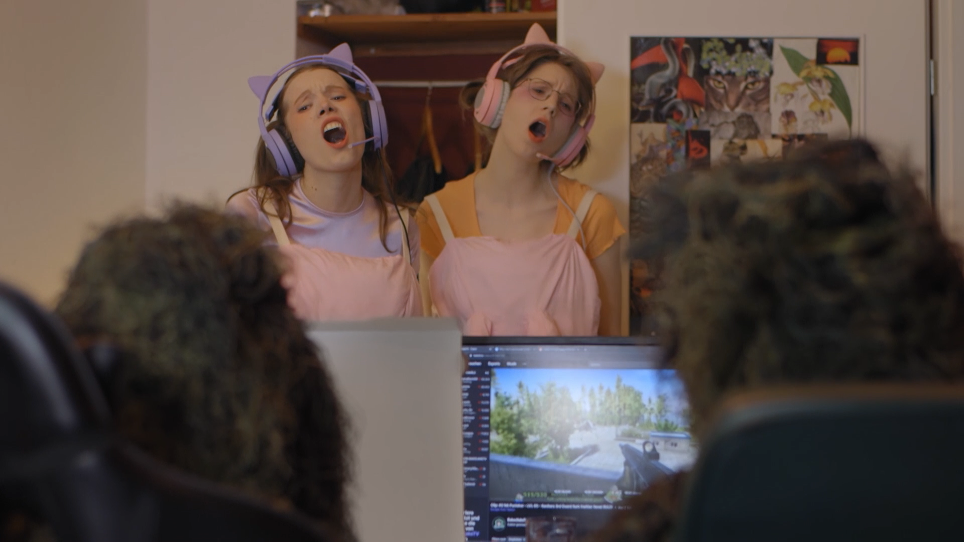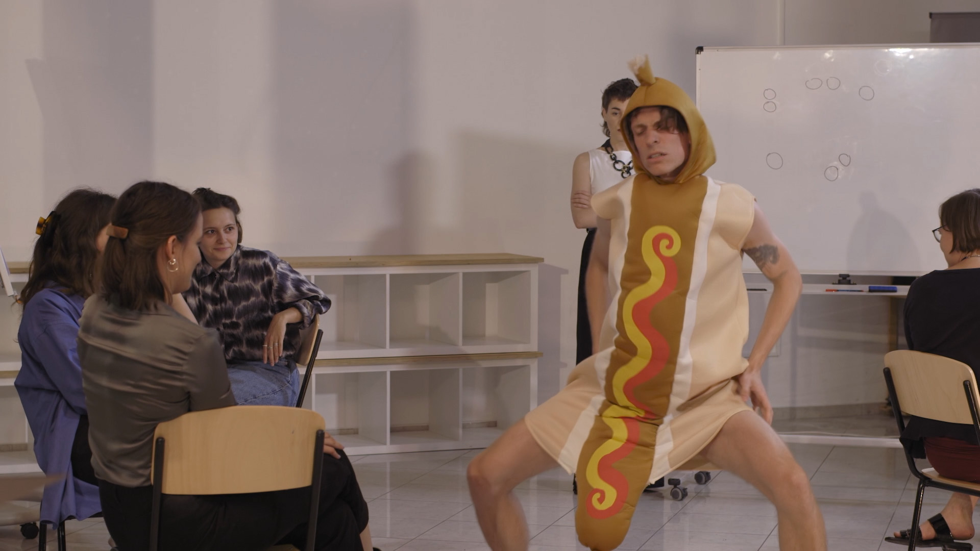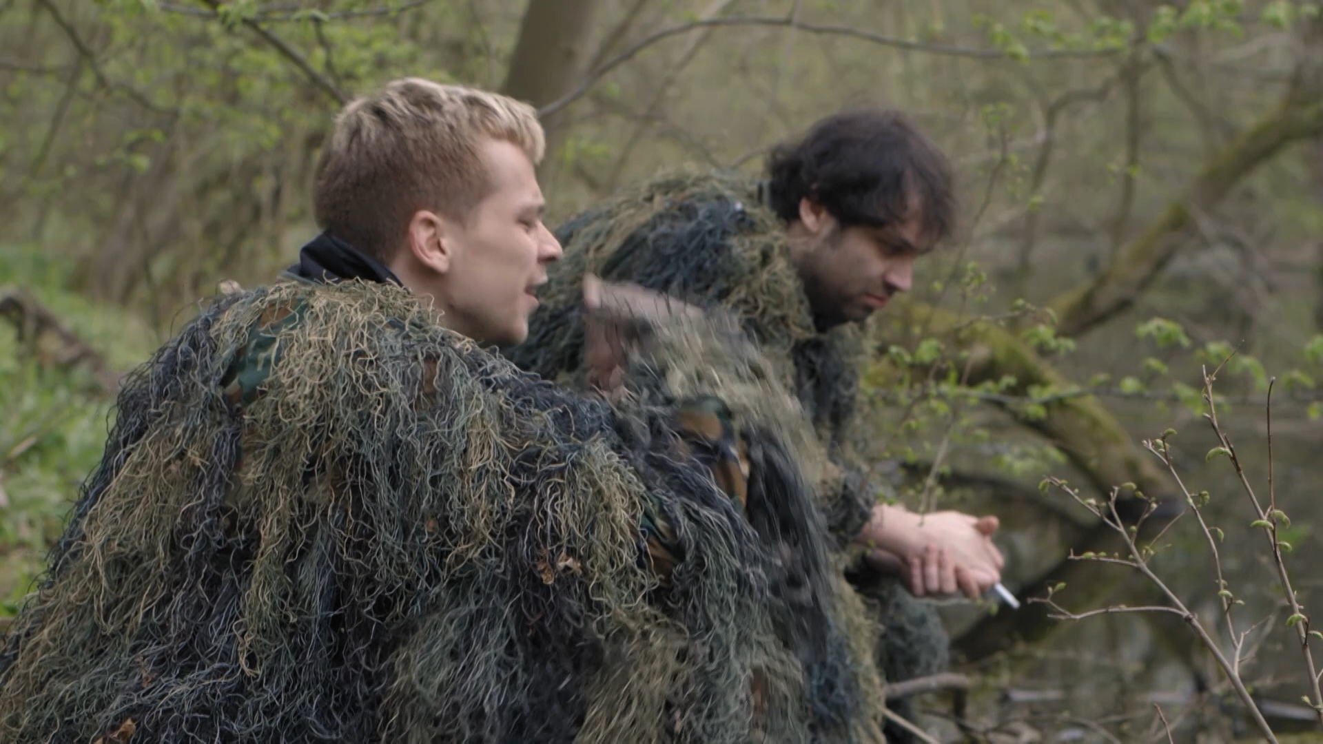 The work outlines two contradicting lifeworlds: while a group of educated, middle-class, young women are longing for a world without inequalities, two resentful young men in ghillie suits are sharing cynical internet memes in defence of the “freedom of speech” and their patriarchal power position. Two intellectual figures from outside the two bubbles, one appearing as a ghost-shaped priest and the other one as a feminist researcher, are trying to intervene in both worlds. Yet, instead of softening the algorithmic structures with their benign speeches, ultimately, they amplify the atmospheres they find in the respective bubbles.
