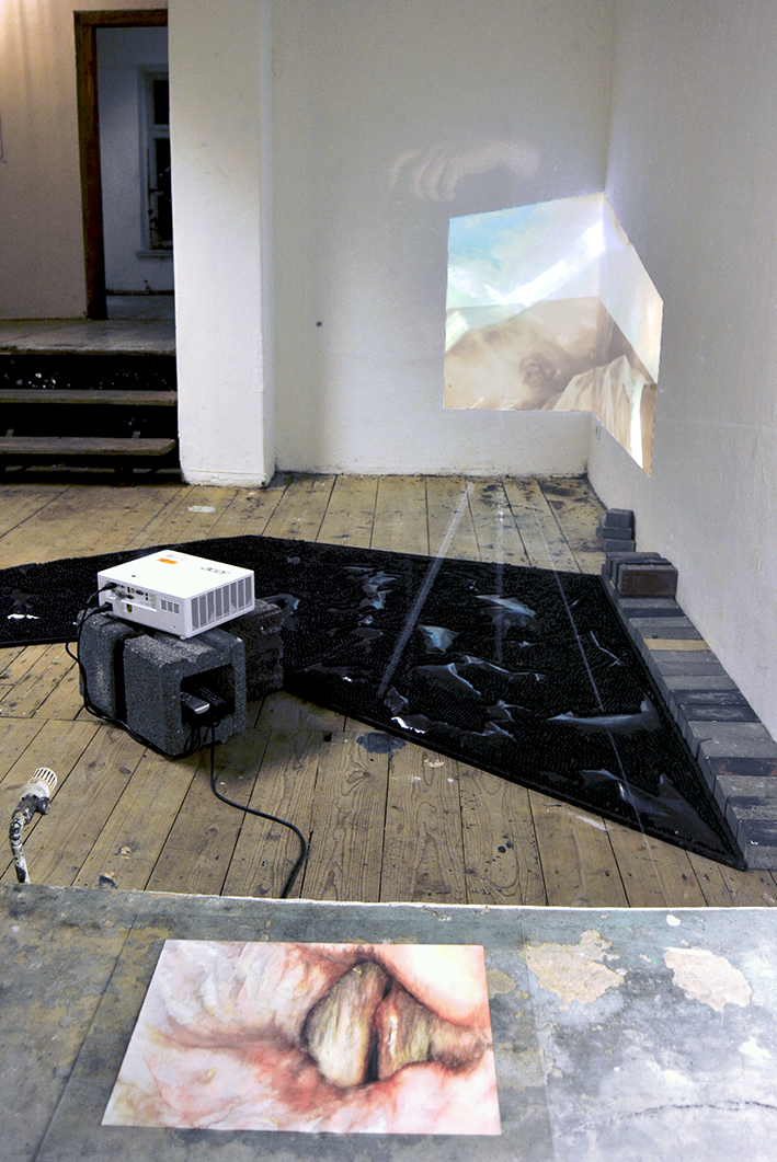 Ausstellungsansicht: Voice, Aquarell, 2021 / Hazy Borders Projektion, 2020 / Superabsorber, 2021