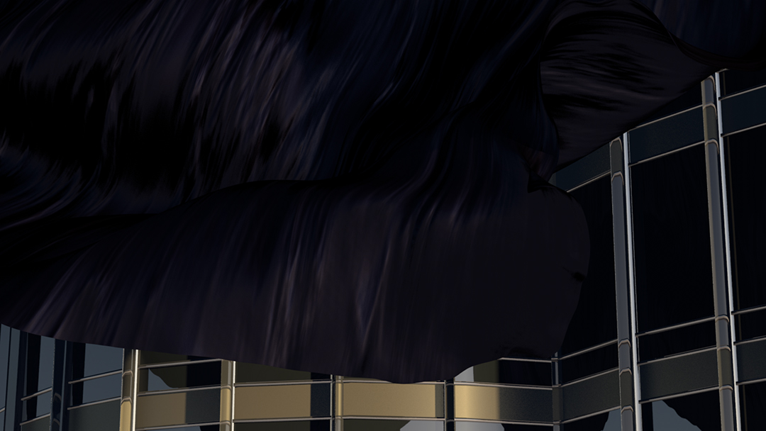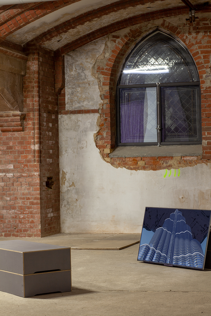 Das höchste Gebäude der Welt, der Burj Khalifa in Dubai, zeigt in Richtung des Himmels und verbirgt sein Inneres hinter der Fassade. Der Wolkenkratzer ist einerseits hypersichtbar und entzieht sich gleichzeitig dem Blick. In der Installation „Cold Glass Doesn't Flow“ wird die kühle Härte des Wolkenkratzers der fließenden Verhüllung von Textil gegenübergestellt.