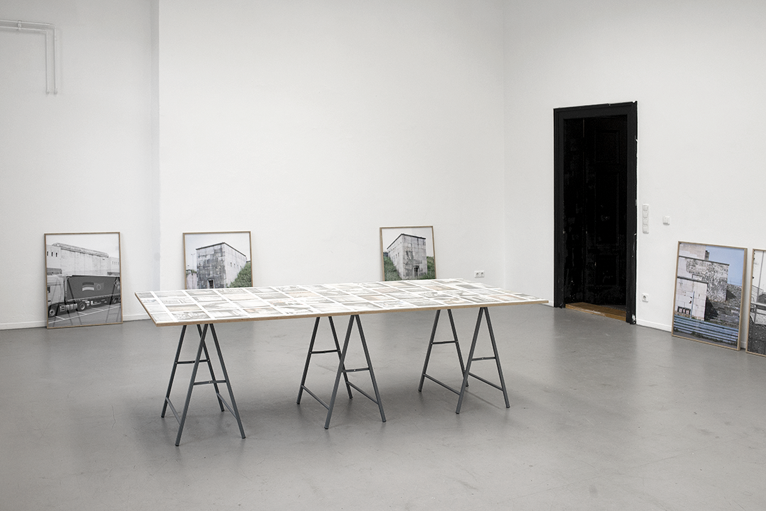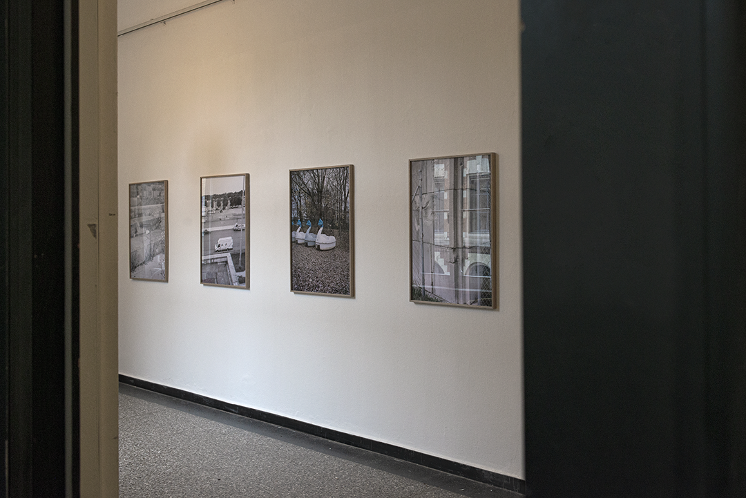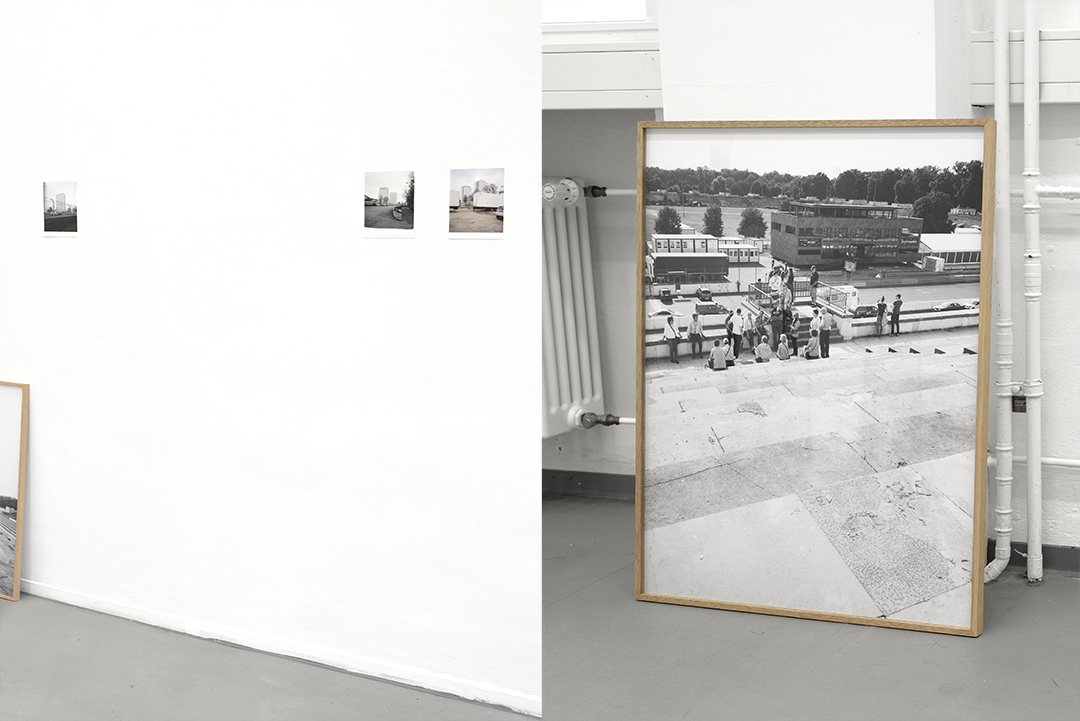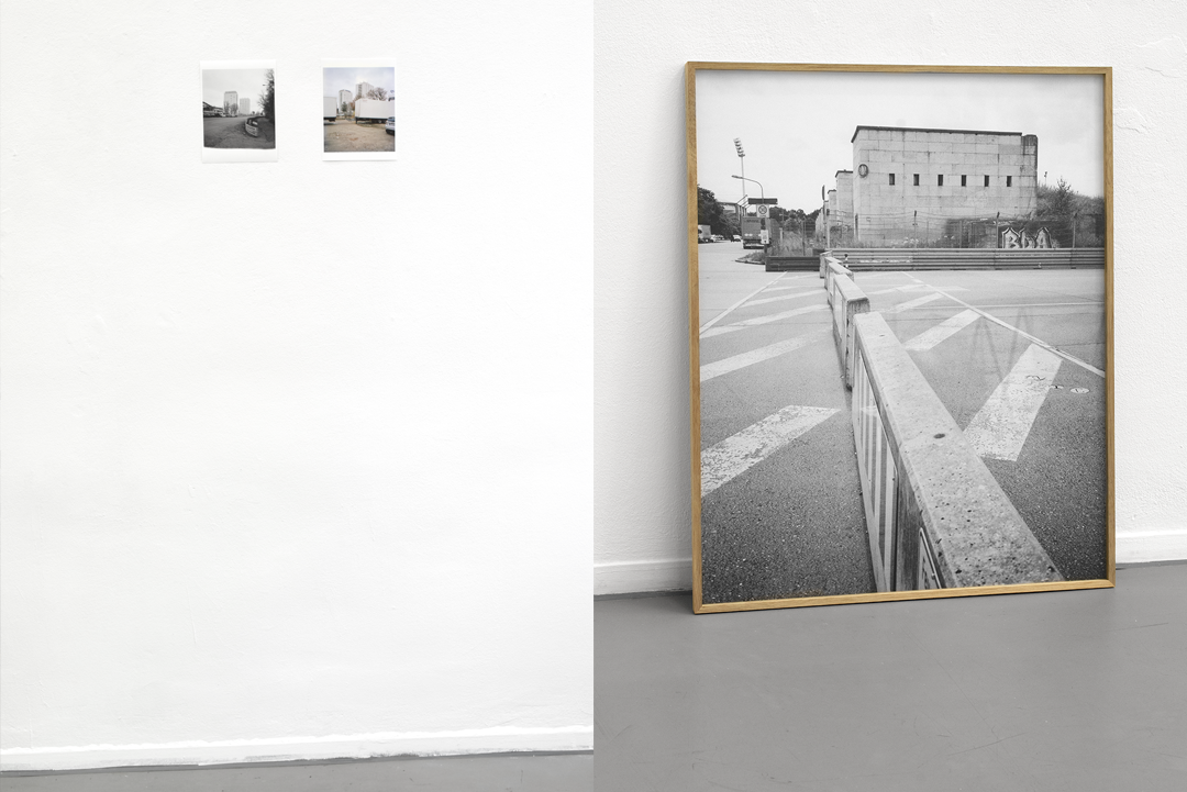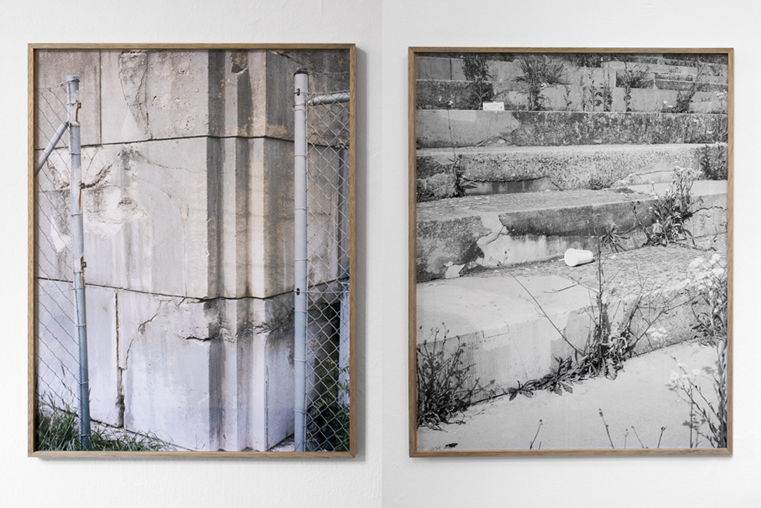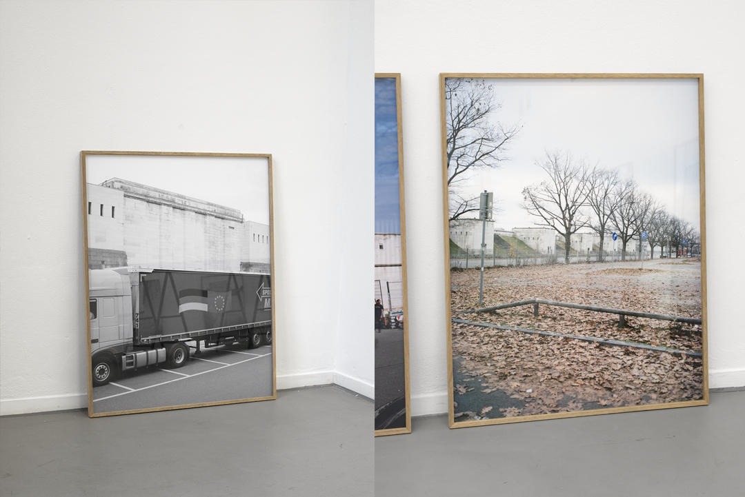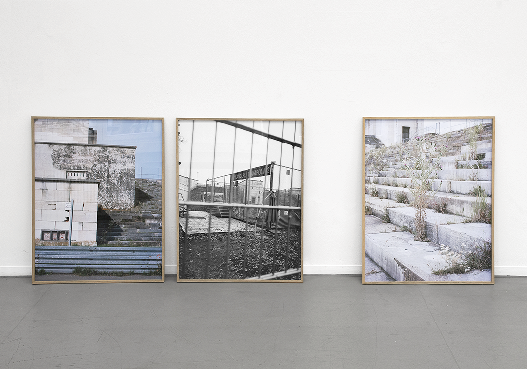 Das Fotografieren vor Ort begriff ich dabei nicht als reines Abbilden, sondern als entschiedene Intervention mit der Kamera, die bewusst gegen den faschistischen Größenwahn vorgeht. Anhand stürzender Linien der perspektivischen Verzerrung und leichten Kippmomenten, gerät die Architektur der Zeppelintribüne ins Stolpern. Der Fokus aufs Detail dekonstruiert den Überwältigungsimperativ der Kongresshalle. Die Verwendung sowohl von Schwarzweiß und Farbe, als auch die Darstellung eines Motivs aus mehreren Blickwinkeln hinterfragen den dokumentarischen Evidenzanspruch in der Konstruktion von Raum. Im Rahmen auf den Boden lediglich an der Wand gelehnt oder als Bogen auf den Tischdisplay verschieben sich die Machtrelationen der Proportionen und das Fassadenhafte der faschistischen Architektur wird ersichtlich.