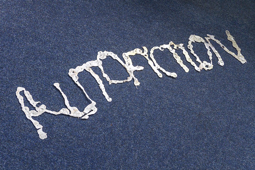 In his graduation show "In a Coded World, There is Nothing Like Normcore", David Rank navigates viewers through an abandoned office space, whose remnants, materiality and enigmatic messages interrupt the continuous flow of time, towards a glitch of temporal and spatial components in which brand messages look like archaeological finds of a time that is already running parallel, is yet to come or cannot take place.