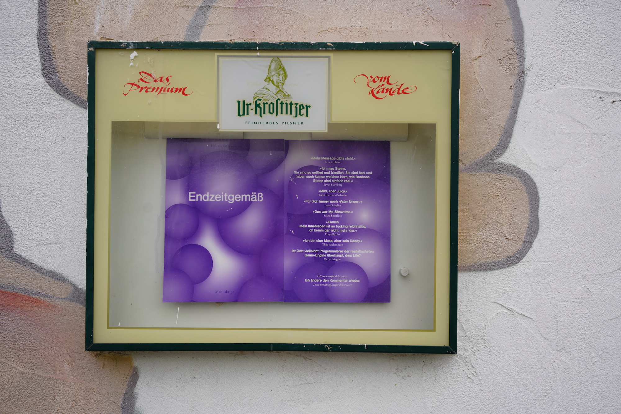 The novel manuscript "Endzeitgemäß" was written within the last two and a half years. It locates science fiction as a parable for the present. The Novel deals with topics such as conspiracy myths, East Germany, the end times and love in the modern age. In the process, the manuscript develops a neo-speak that captures a sense of the so called "contemporary". It was presented for the first time in the form of a reading for the diploma.
