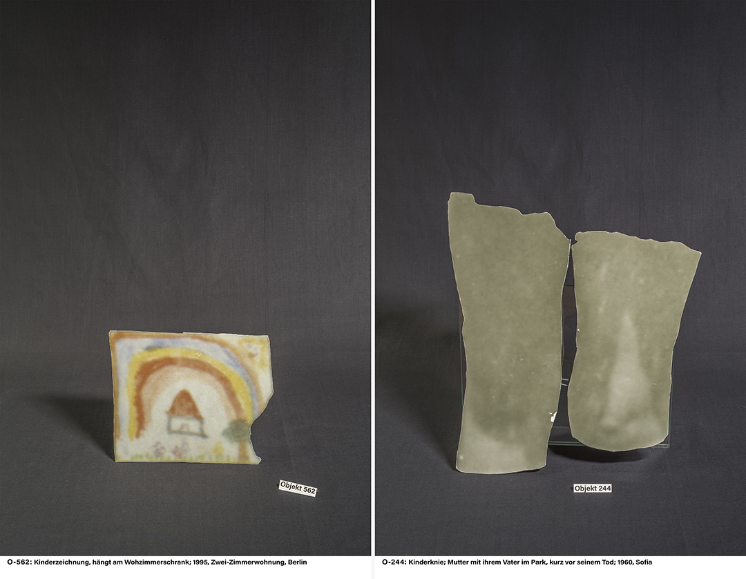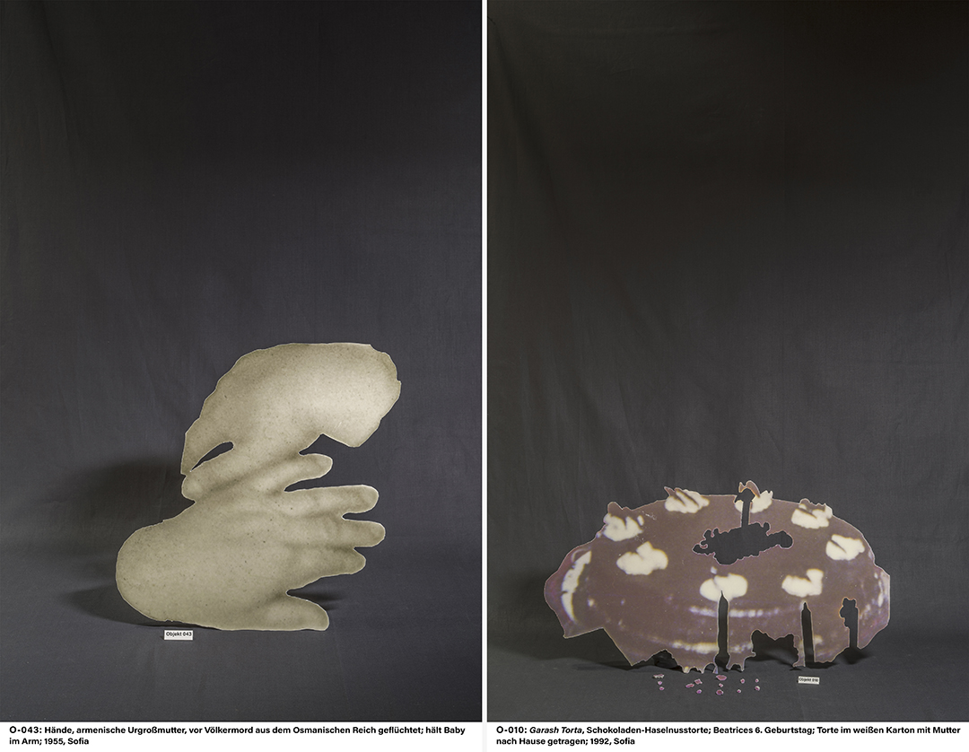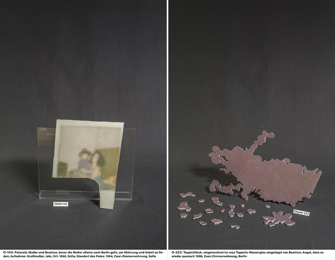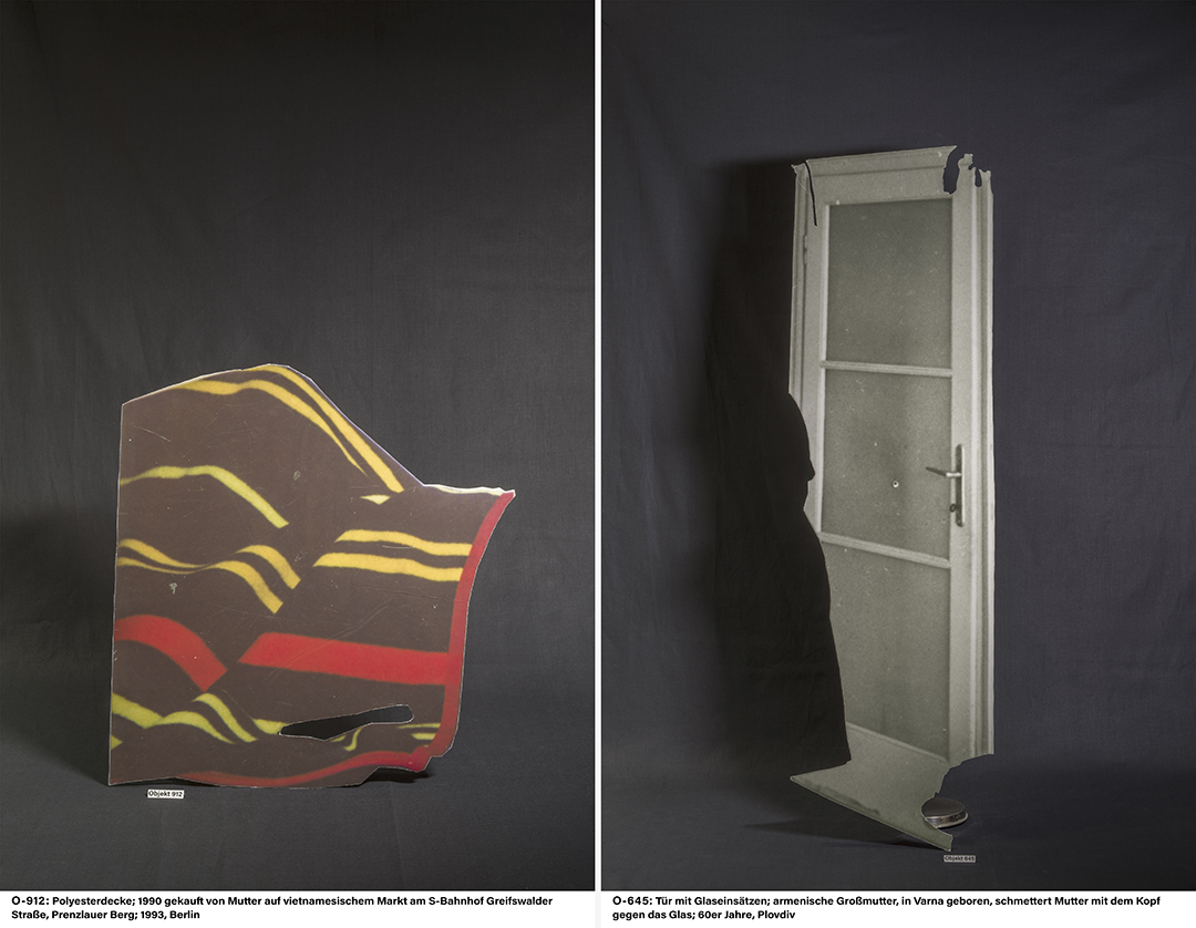 Ich habe alle Familienfotos gescannt, die mir übrig geblieben sind. Sie wurden in Bulgarien und Deutschland zwischen den 1930er und 2000er Jahren aufgenommen. Die Fotos habe ich digital auseinandergeschnitten und tausende von Objekten extrahiert wie Spielzeug, Möbel, eigene und fremde Körperteile. Zu jedem dieser Objekte schreibe ich etwas auf. Woran es mich erinnert oder Wissen über dessen Ursprung und Bedeutung. Als nächsten Schritt habe ich die vergroesserten Elemente auf Fine Art Papier ausgedruckt und auf Kunststoffmaterial montiert, und in einem körperlich aufwändigen Prozess erneut ausgeschnitten. Jetzt sind die einzelnen Elemente aus der Begrenzung des viereckigen Fotos wieder in räumliche Objekte übersetzt worden.