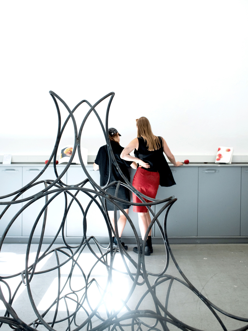 The object in the room shows a large-scale fruit pyramid, which in its actual size serves to store fruit. Losing its original function it now evokes the association of a climbing frame. But in order to climb to the top of the career – self-fulfilment – the four other levels of Maslow's hierarchy must first be overcome.