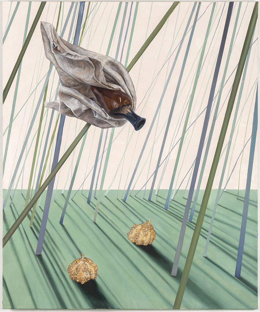 The starting point for the motifs is usually an everyday object (for example, an old cloth, a vase or a dry pumpkin) or a collection of them. First, she assembles the objects into a wall installation using threads and wires. Suspending the objects in the air is an important aspect that removes the stability of the floor. This gives the objects a subtle movement and the composition a theatrical narrative that runs counter to the typical genre of still life. The everyday objects are thereby protagonists in subtle events whose cause is similarly encoded as the subconscious itself. Sometimes they are meditative states of mind, sometimes emotional expressions, which are, however, veiled by the restrained character of the realistic representation.