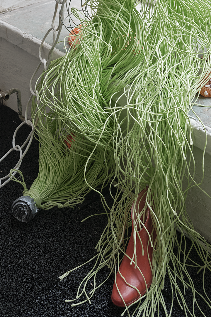untitled | detail | Klimmzugstange, Teleskopstange, Besenstiel, Pressengarn | 2021 |