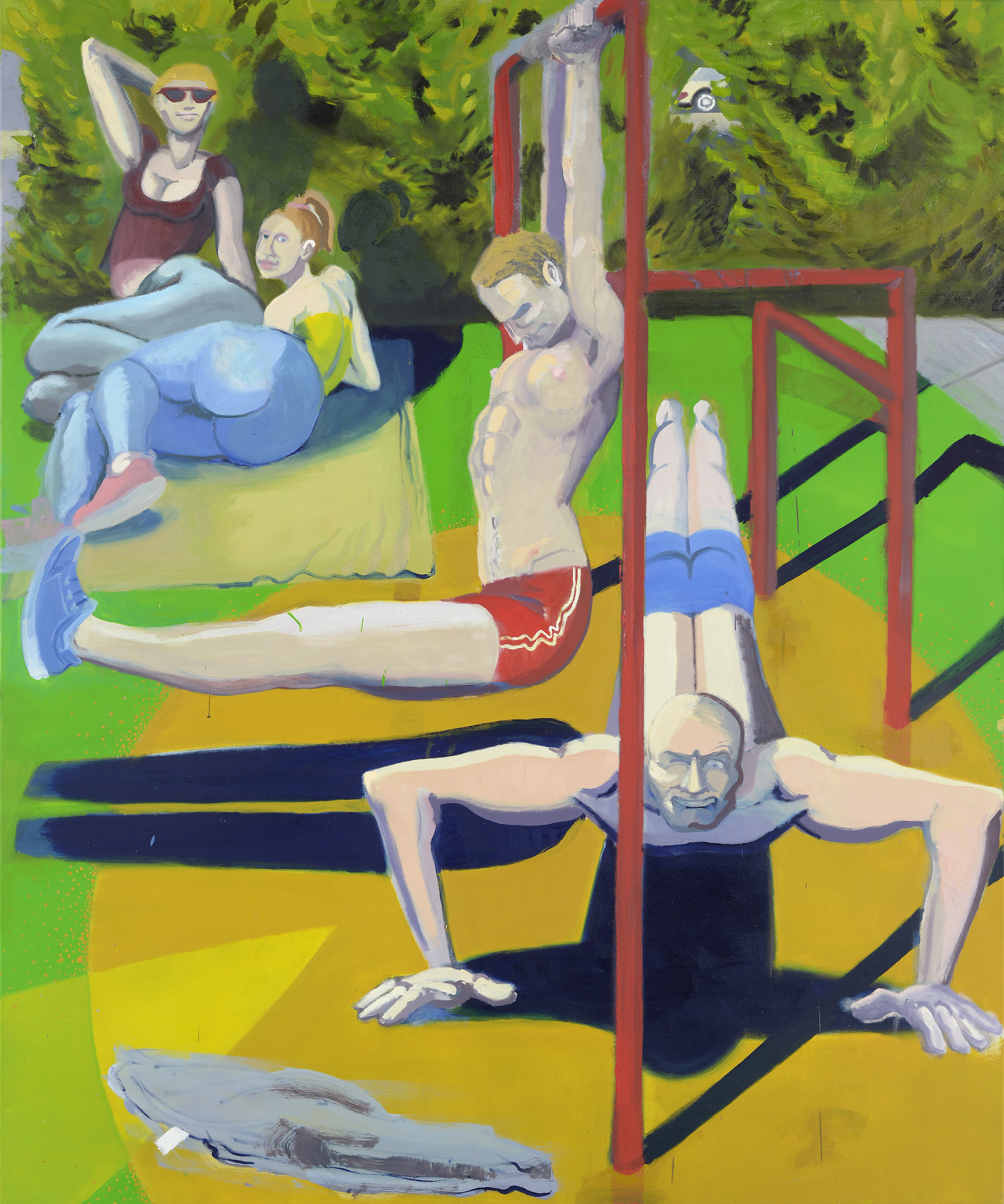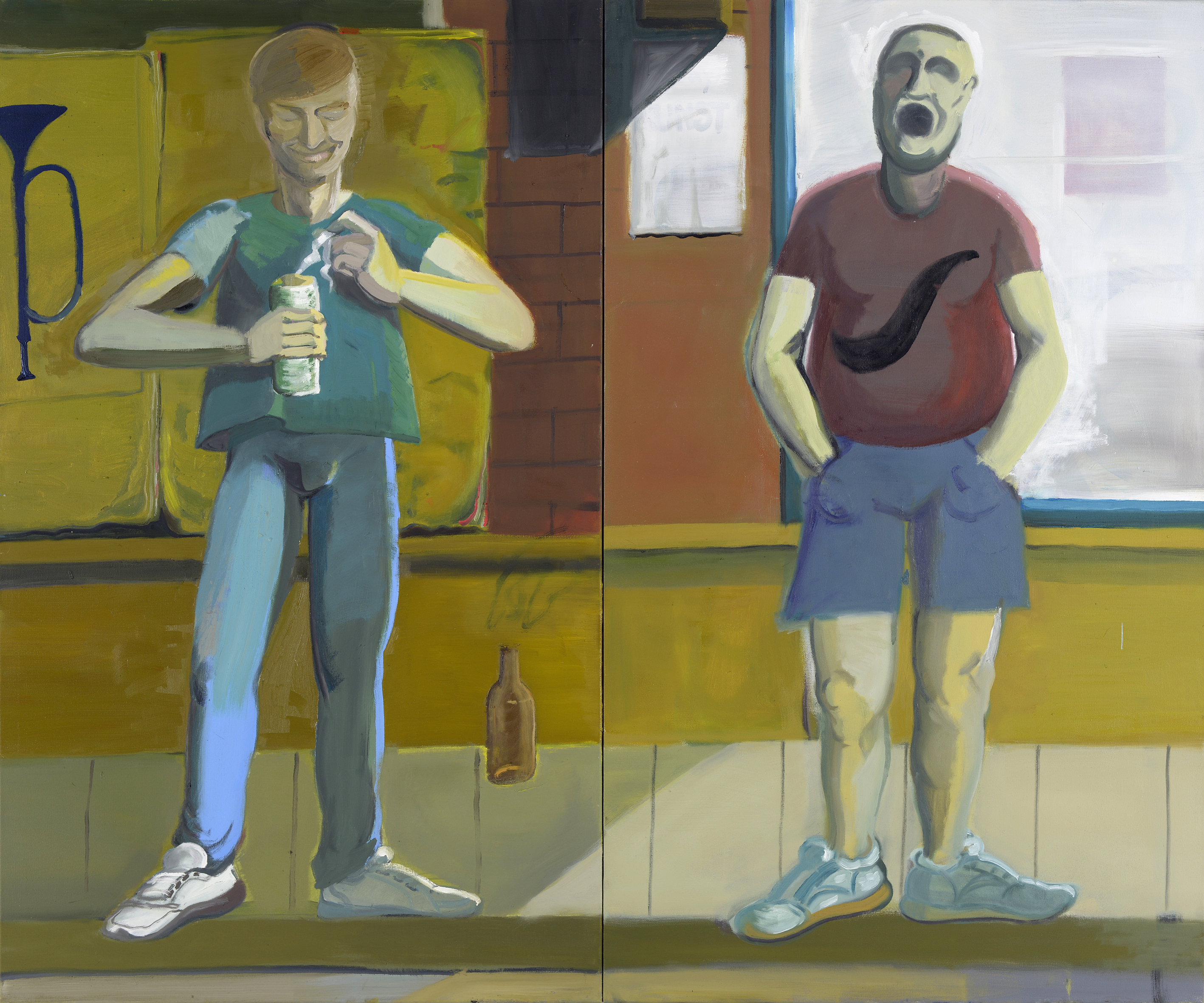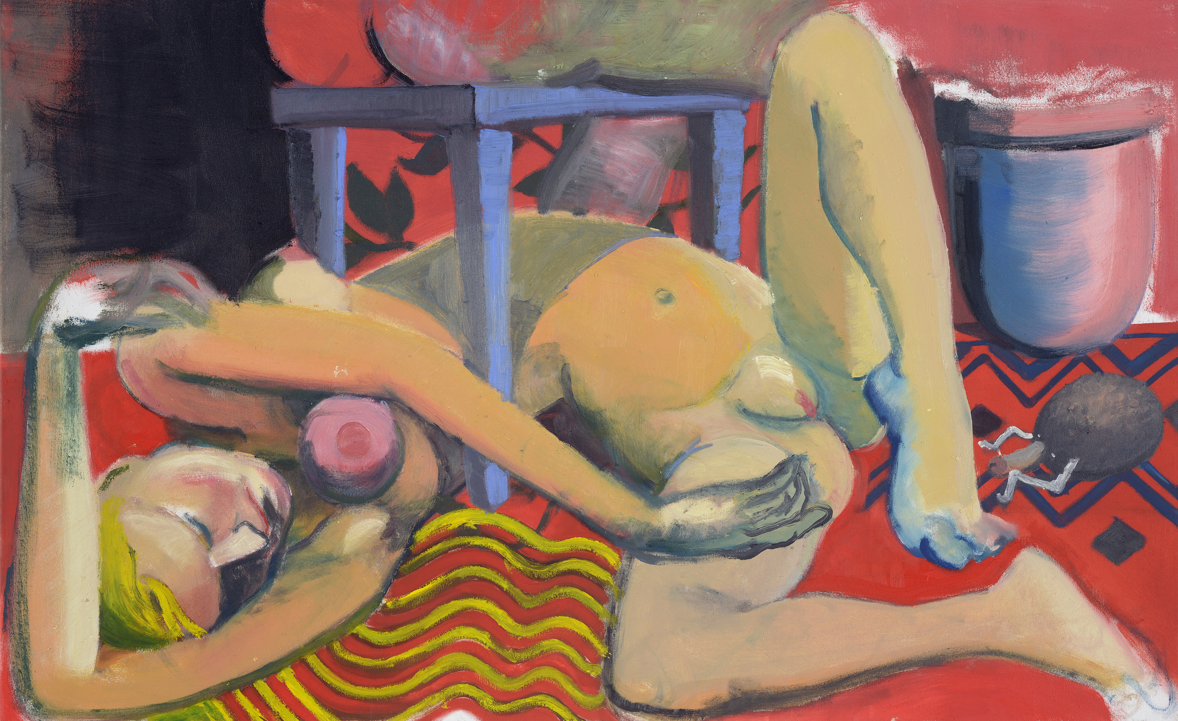 Formal und kompositorisch habe ich für mich mit den jüngsten Bildern einen Weg gefunden, Bild abstrakter zu denken. Indem ich meine Figuren, die Bildfläche von Bildrand zu Bildrand durchmessen lasse, entstehen Kompositionen die den Rand als Grenze herausfordern und so eine rhythmische Spannung erzeugen. Formen wandern über die Fläche, den Rändern entgegen, werden umgelenkt und suchen ihren Fortgang innerhalb der Grenzen des Bildes.