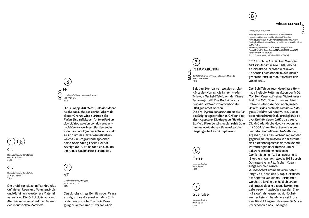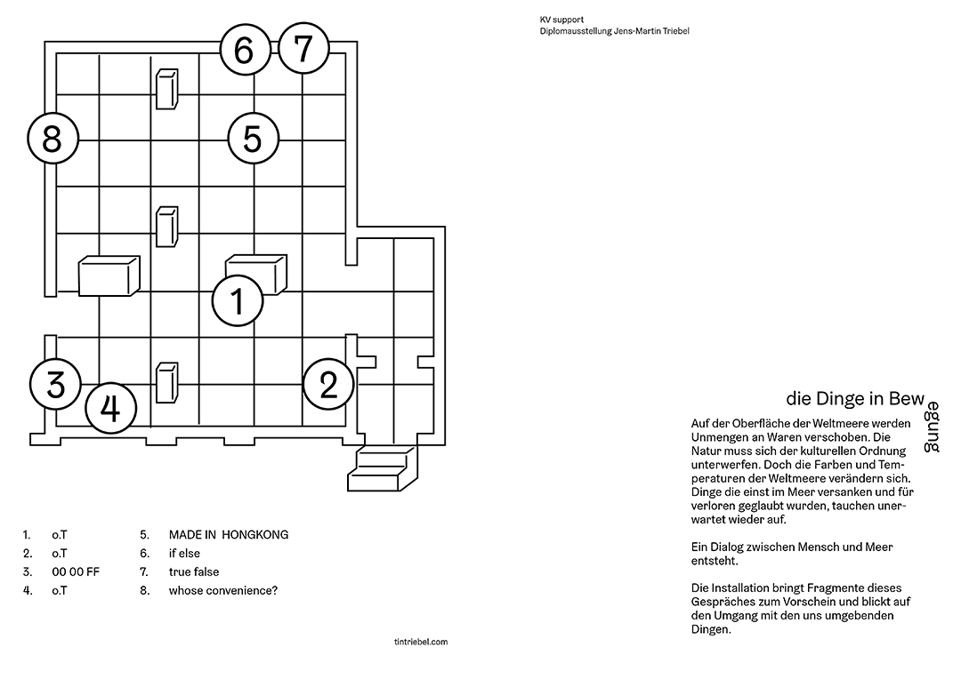 Auf der Oberfläche der Weltmeere werden Unmengen an Waren verschoben. Die Natur muss sich der kulturellen Ordnung unterwerfen. Doch die Farben und Temperaturen der Weltmeere verändern sich. Dinge, die einst im Meer versanken und für verloren geglaubt wurden, tauchen unerwartet wieder auf. Ein Dialog zwischen Mensch und Meer entsteht. Die Installation bringt Fragmente dieses Gespräches zum Vorschein und blickt auf den Umgang mit den uns umgebenden Dingen.