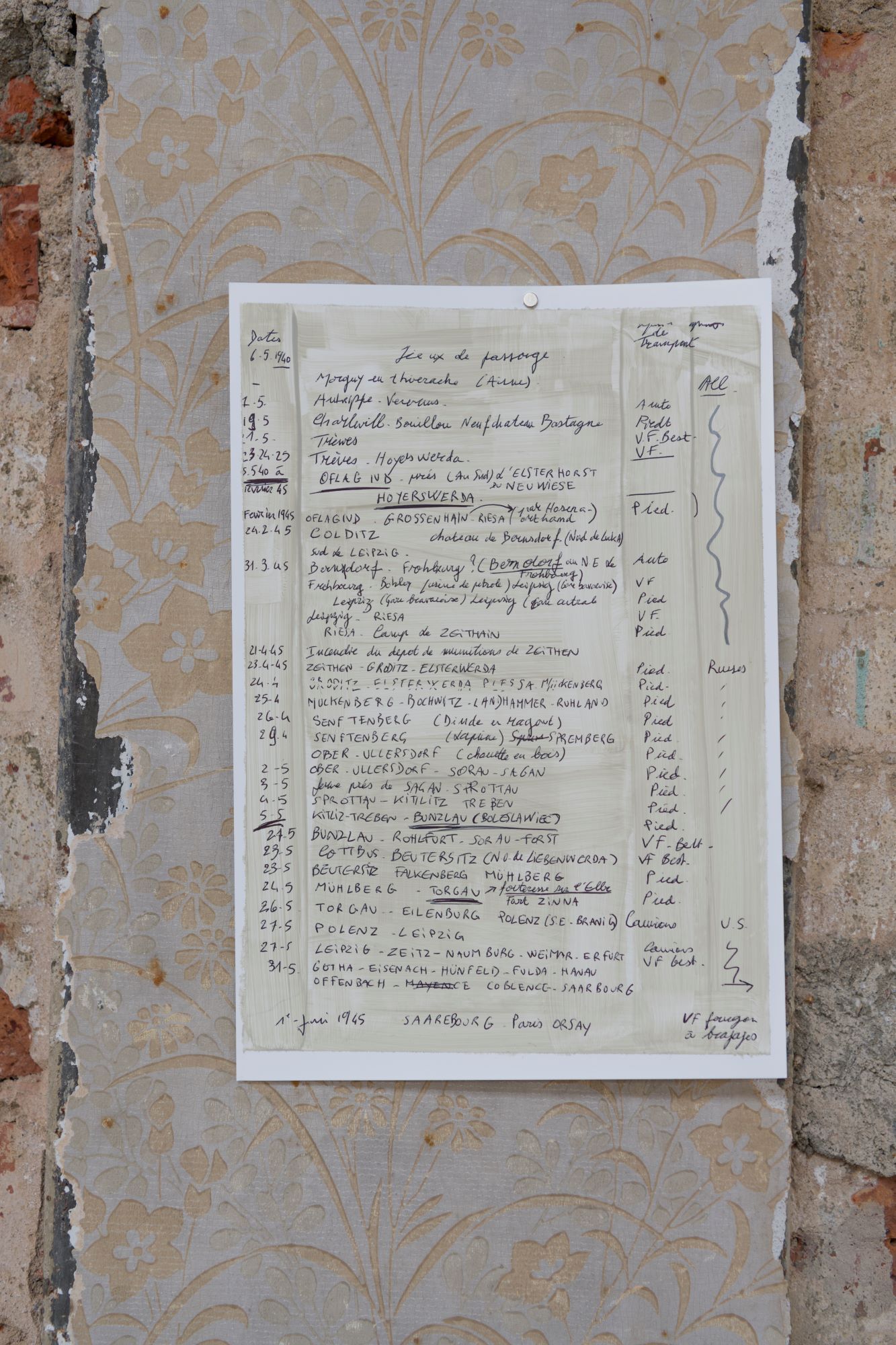 Based on a handwritten document from my grandfather, who was imprisoned in an Oflag (officers' camp) in North Saxony from 1940 to 1945, I developed a research project entitled: Lallemand-e I Die Deutsche. The project name “Lallemand-e” is not only an allusion to the family name, but also a play on words with the masculine-feminine or gender-specific form and at the same time means “the German”. The points of reference for my work are the family archive and the archive of the East German Documentation Center Elsterhorst.
