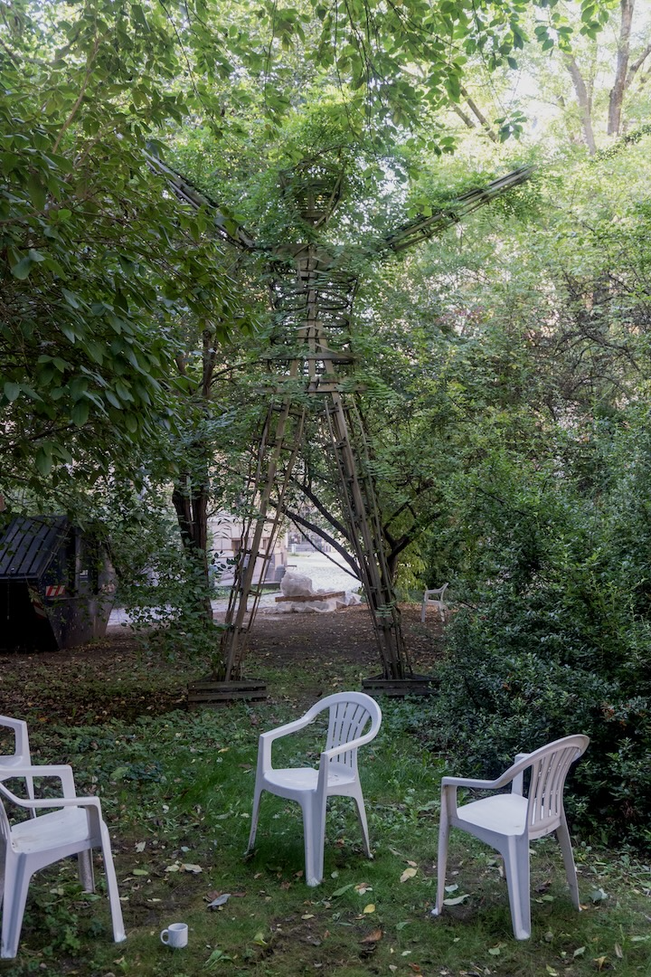 At the threshold on the grounds of the former botanical garden of the Leipzig Institute of Gynecology – today at the intersection of the backyards of the Academy of Visual Arts (HGB), the Bibliotheca Albertina and the Federal Administrative Court – an anthropomorphic wooden figure serves as a climbing aid for climbing medicinal plants: Yam, fenugreek and blue vine. In their molecular relationship to our bioidentical oestrogens, the phytohormone diosgenin of the first two plants mentioned serves as the starting material for our processed hormone preparations.