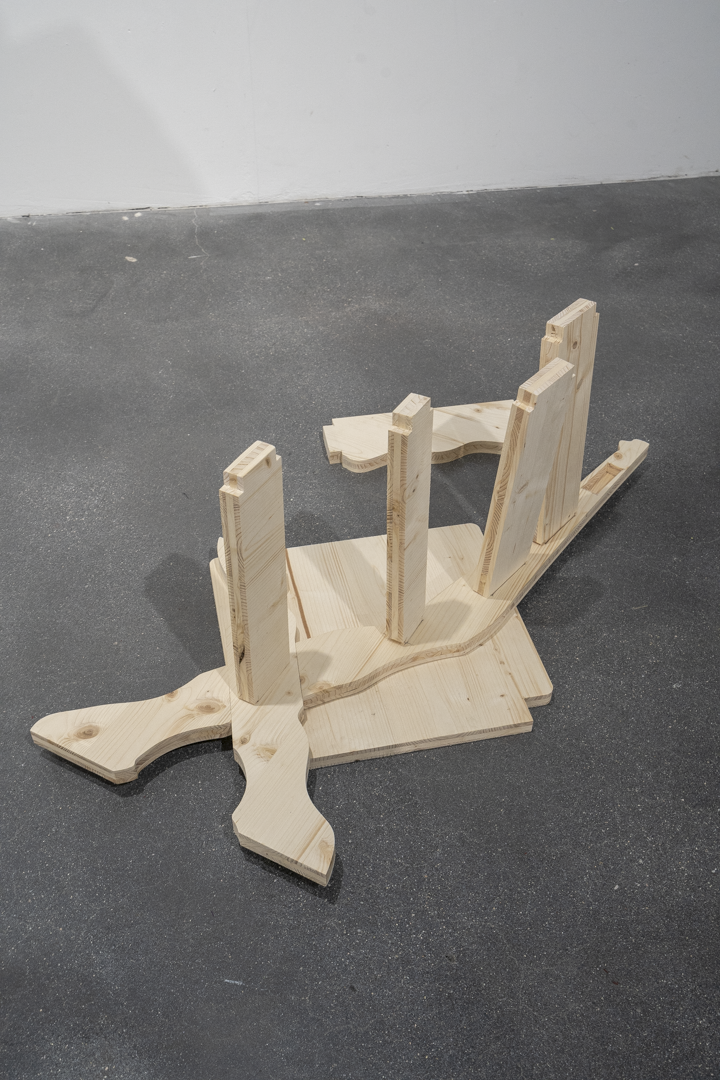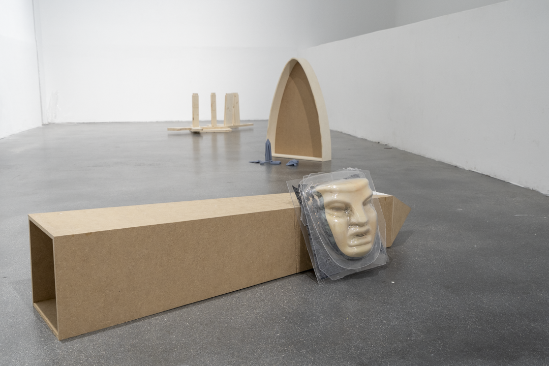 In the diploma exhibition ‘My Room of pictures - Mein Raum der Bilder’ we find a collection of three-dimensional objects made of wood and plastic. Formally, these move in the field of historicist forms and symbols that have been materialised with the help of craft and construction techniques. Forms familiar from the history of architecture and design, such as the obelisk or the Gothic arch, are artistically associated with questions of superficiality and artificiality. Knowing that all the objects originally came from photographs that were translated into physical space with the help of the artist's own spatial imagination, it becomes clear that the perception of reality and fiction is being played with here. The stage-like arrangement in the room and the play with scale suggest a situation like a surreal chamber play that challenges the viewer's own perception to the point of unconsciousness.