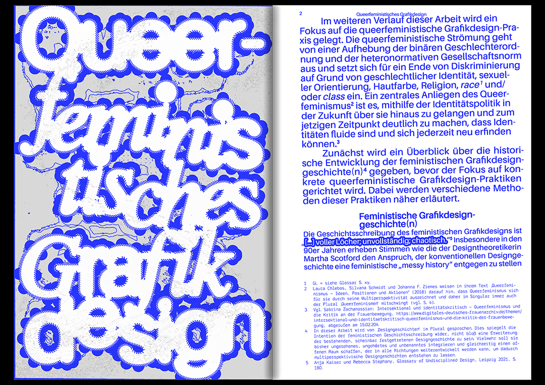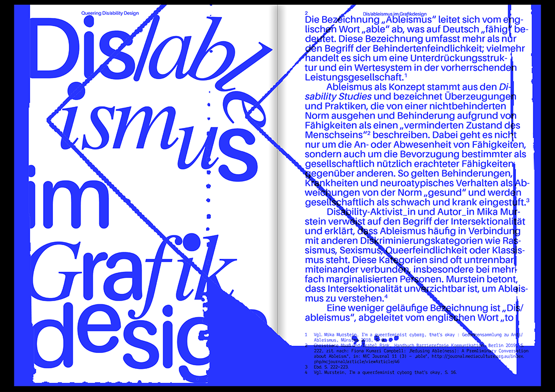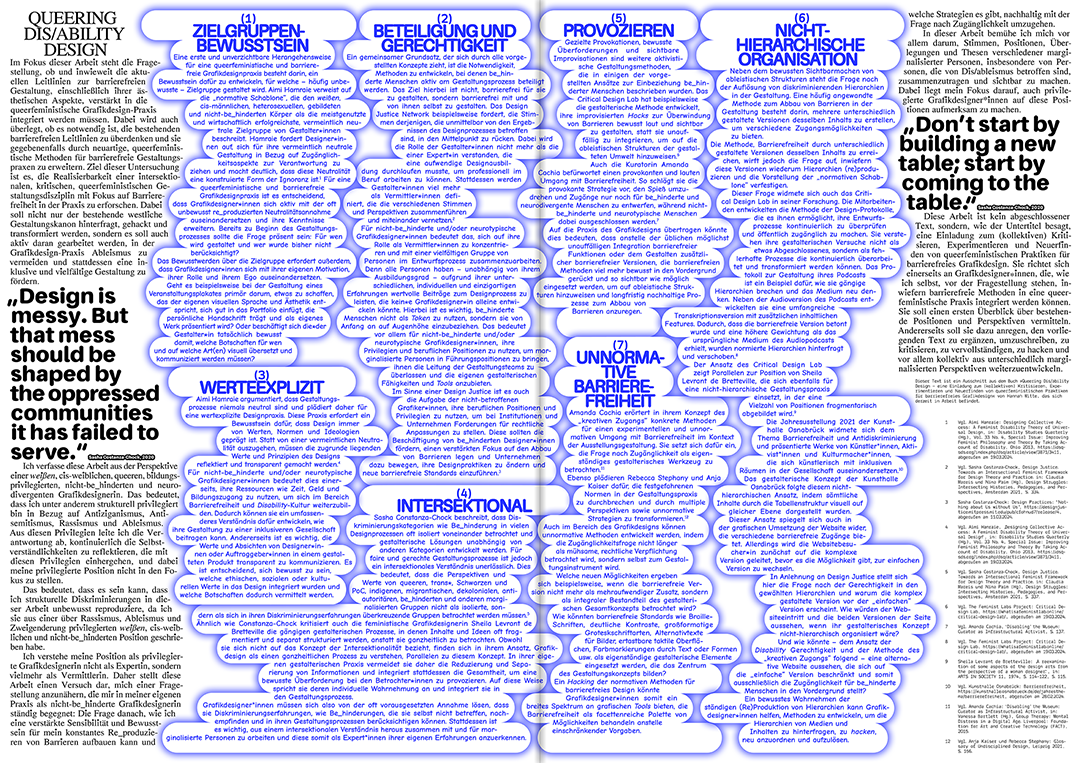 This work invites (collective) critique, experimentation and reinvention of queerfeminist practices for accessible graphic design. The aim is not only to question, hack and transform the existing Western design canon, but also to actively work to avoid ableism and instead promote inclusive and diverse design. The focus is on the extent to which current standards for accessible design, including their aesthetic aspects, should be increasingly integrated into critical, queerfeminist graphic design practices. At the same time, it will consider whether there may be a need to rethink existing accessibility standards and, if necessary, expand them with new, queerfeminist methods for accessible design practices.