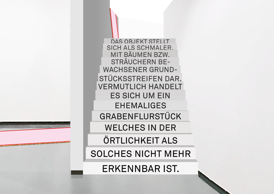 Neben den eingebauten Flurkarten sind Textfragmente angebracht, die aus der Beschreibung der Auktion zu den jeweiligen Objekten entnommen sind und als Anlage zum Kaufvertrag angefügt wurden. Sie dokumentieren einen vermeintlich „objektiven“ Zustand der tatsächlichen Orte und ihrer Umgebung und stellen eine Verbindung zum Aussenraum her. Durch die Größe und Positionierung der Schrift sollen auch die Texte als eigenständige Objekte wahrgenommen werden und eine Verbindung zur Architektur der Galerie aufbauen.