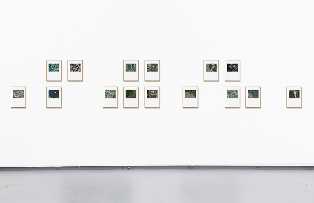 Eingeleitet wird die Ausstellung durch eine Serie von gedruckten und gerahmten Orthofotos mit eingezeichneten Liegenschaftskarten, auf denen farbig hervorgehobene geometrische Formen Grundstücke markieren, die in mein Rechercheraster passen und für die ich einen Bietantrag gestellt habe. Die Recherche und Suche nach Grundstücken ist stark abhängig vom Angebot und es zeigt sich, dass meine künstlerische Auseinandersetzung mit Grundeigentum eng an die Dynamiken und Verhältnisse eines Marktes geknüpft ist. Zum anderen bringt das auf die Fotografien eingezeichnete Netz der Liegenschaftskarten die sonst vielerorts auch unsichtbaren Grenzen in unserer Umwelt zum Vorschein.