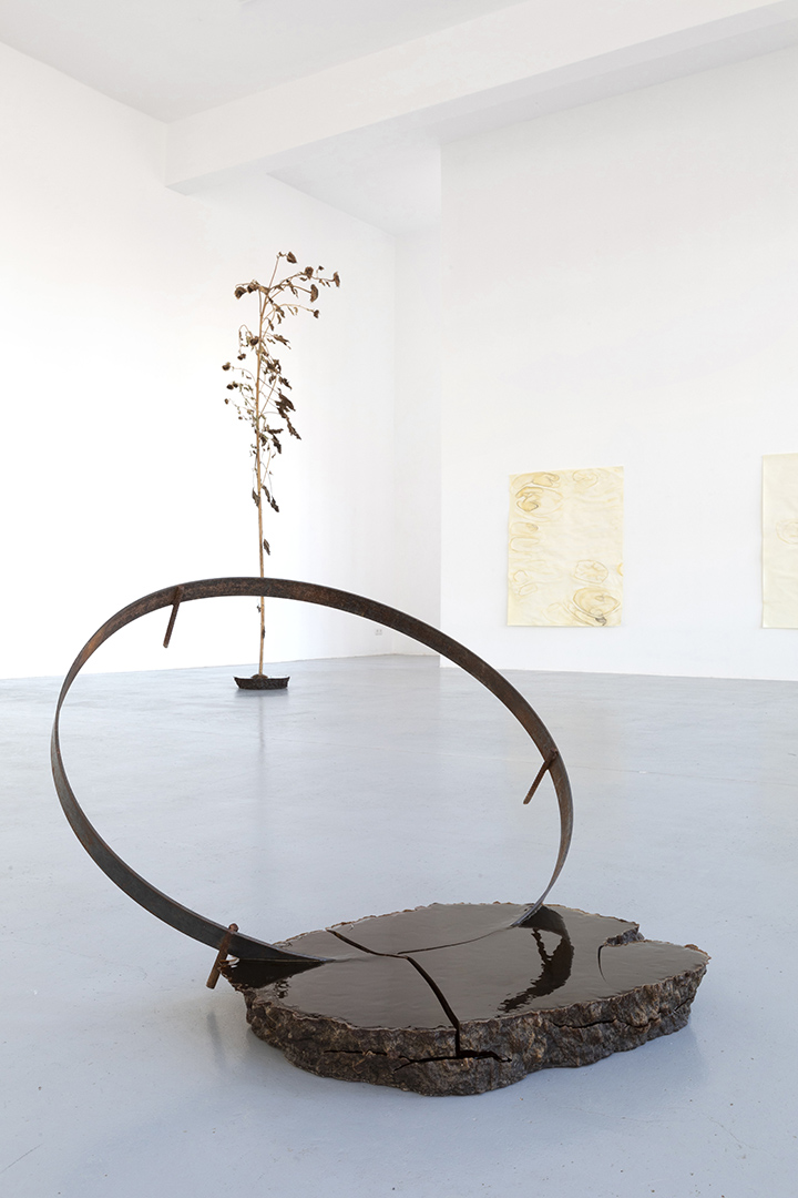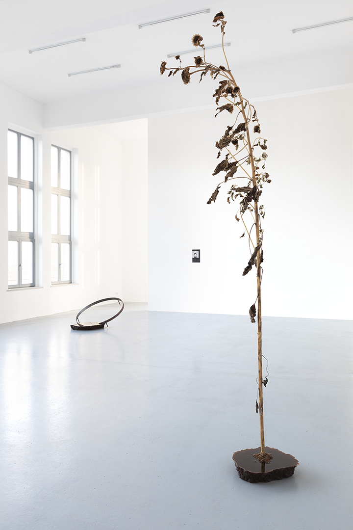 In The Sun Rises When It’s Ready, Viktoria Sophie Conzelmann (*1988) examines how we generate knowledge about ourselves and other organisms, bringing almost invisible processes that make up the world around us to the surface. Tensions in matter and formations of minerals take center stage, revealing ruptures in solid material, imprints of chemical reactions and evaporation. The life cycle of a sunflower is frozen in time, yet ready to spread its seeds – much like the minerals and nutrients that pass through our human bodies disperse and build new alliances. Similar to the sculptures and PH-indicator drawings, a seven-minute audio loop circles around dreams and experiences of birth, the inside of Earth and the human body as our indispensable apparatus for experiencing the world.