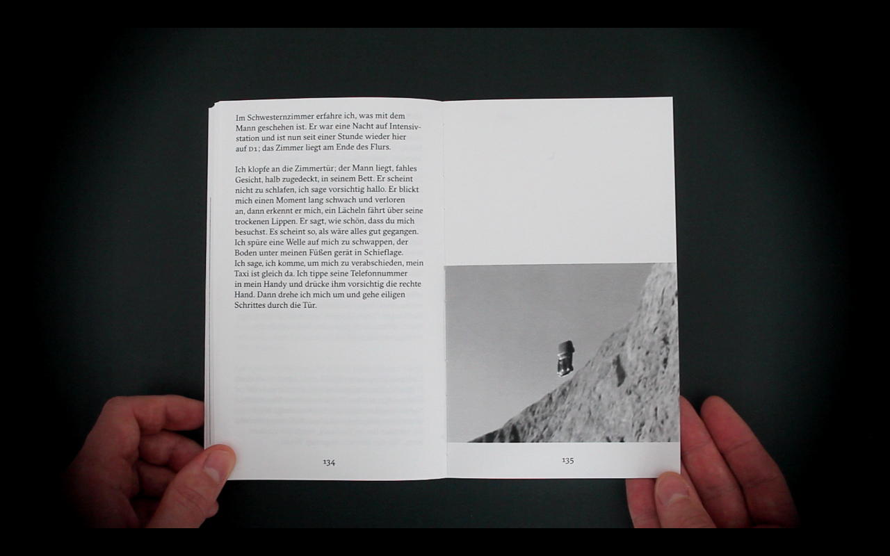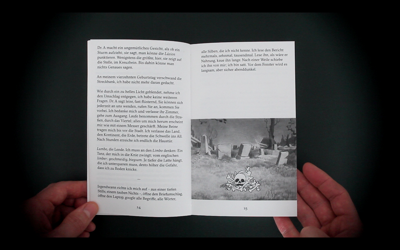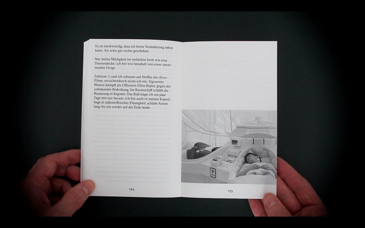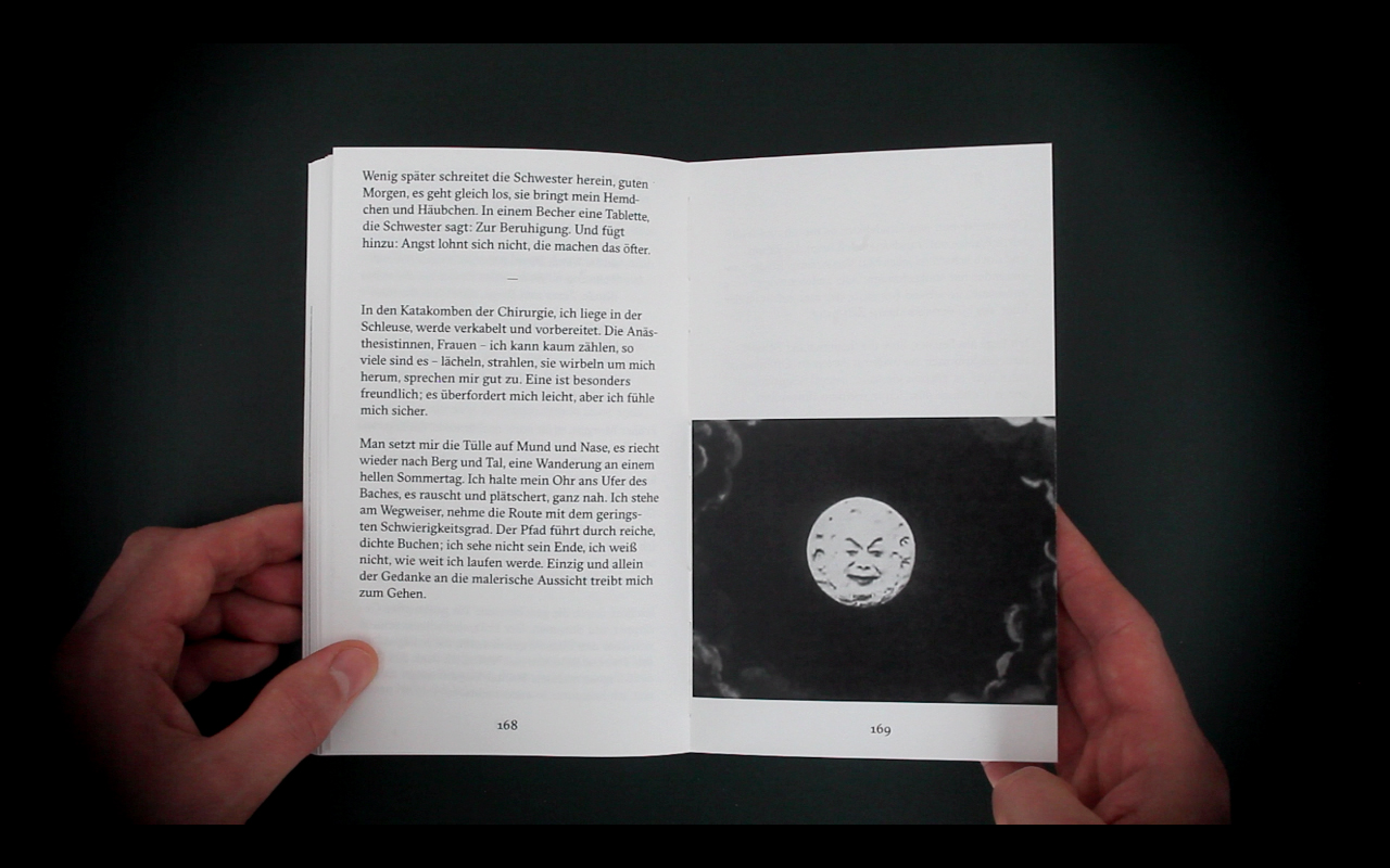 Die 25 Schwarz-Weiß-Abbildungen im Buch sind zum großen Teil eigene Handyfotos, ein kleinerer Teil sind gefundene Illustrationen sowie Stills von Filmen, die ich auf youtube oder Netflix gesehen habe. Während die Handyfotos eigene Beobachtungen visualisieren und im Jetzt verortet sind, öffnen die gefundenen Bildinhalte Türen in fremde, fernere Kontexte — sei es die Darstellung einer in Sand gezeichneten Schildkröte auf Vanuatu oder der Eisabbruch an einem Gletscher in Island. Die Abbildungen in ihrer Gesamtheit haben mit dem Thema Krankheit nur wenig zu tun. In ihrer Funktion sind sie dem Text komplementäre Begleiter, sie setzen Momente des Betrachtens, schaffen Pausen in der Lektüre.