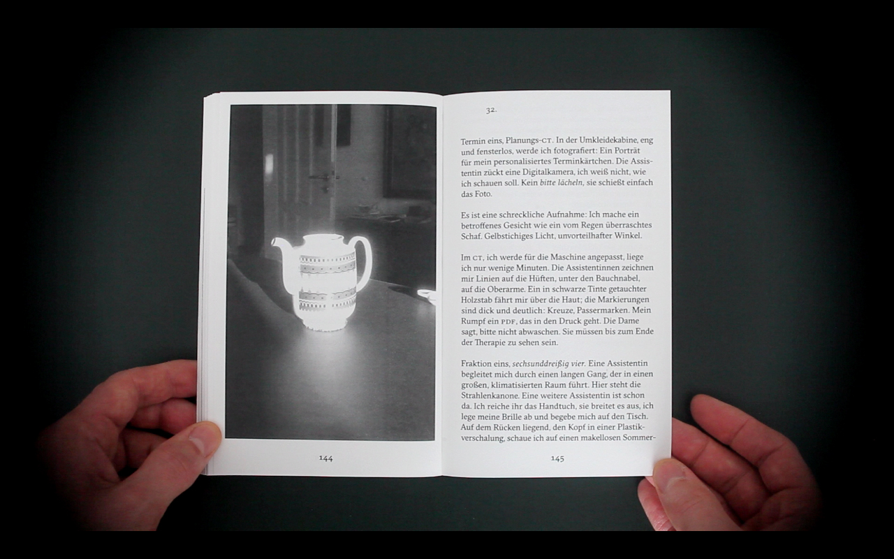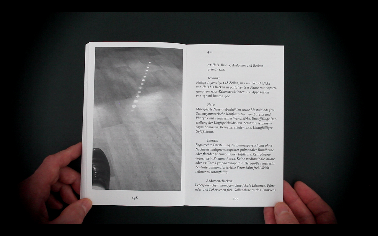 In drei Kapiteln, gegliedert in 42 Abschnitte unterschiedlicher Länge, läuft der Text durch das Jahr — erzählt von Blutentnahmen und Untersuchungen in Magnetresonanztomographen, Gesprächen mit Ärzten, Gesprächen mit Bettnachbarn, dem Aufwachen nach Vollnarkosen und dem Genesungsprozess. Whatsapp-Nachrichten, Traumbeschreibungen, Notizen zu Lektüren und Filmen tauchen unvermittelt auf. Den persönlichen Aufzeichnungen stehen dabei immer wieder auch äußere Dokumente gegenüber: Arztbriefe und Befunde, deren medizinische Fachsprache auf die eigene Sprache trifft. Sie formulieren Fakten über den Körper; nennen Begriffe, deren Bedeutungen sich erst durch’s Googlen offenbaren. Außerdem bildet mit Beginn des zweiten Kapitels die Covid-19-Pandemie einen alles dominierenden Hintergrund: Lockdown, Spaziergänge durch leere Straßen, Liveticker-Konsum.